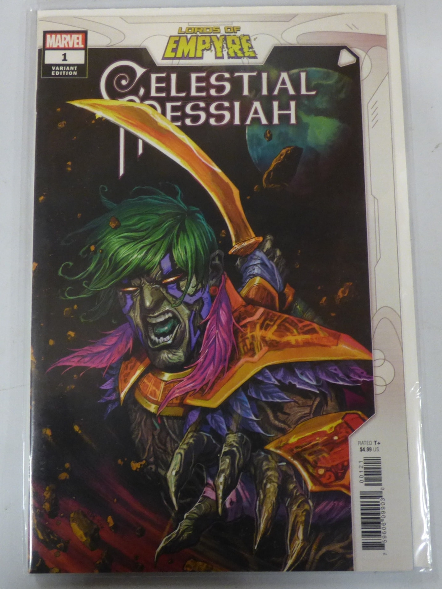 A Marvel comic book, ‘LORDS OF EMPYRE: CELESTIAL MESSIAH’ (Variant Edition) #1, depicts a green-haired character with a golden weapon on a cosmic background.