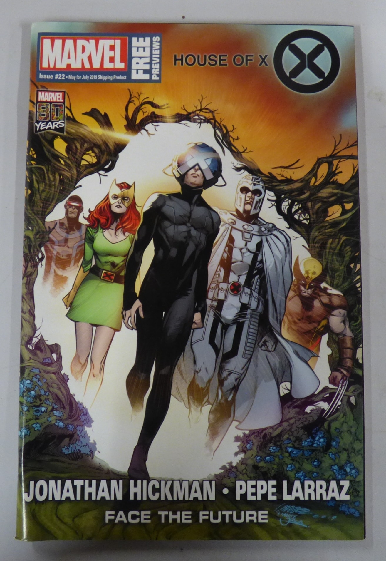 A Marvel House of X comic book, Issue #22, marked “FREE PREVIEWS” and “MARVEL 80 YEARS”, featuring a colourful cover with orange, black, green, and white elements, published May for July 2019 Shipping Product, by Jonathan Hickman and Pepe Larraz.