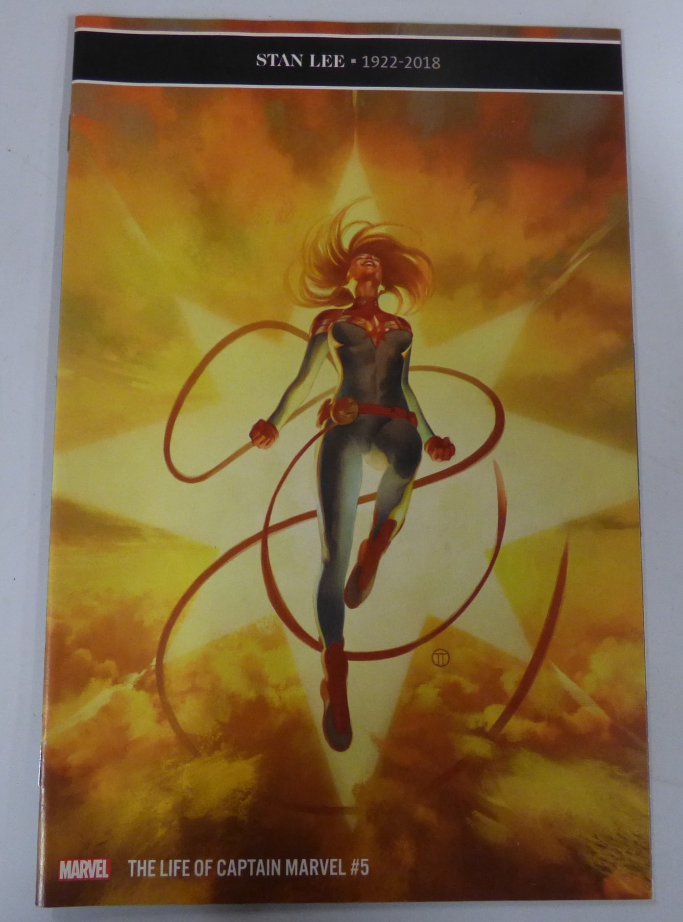 A comic book titled “THE LIFE OF CAPTAIN MARVEL #5” by MARVEL, featuring Captain Marvel in a grey and red suit against an orange and yellow background, with “STAN LEE · 1922-2018” at the top.