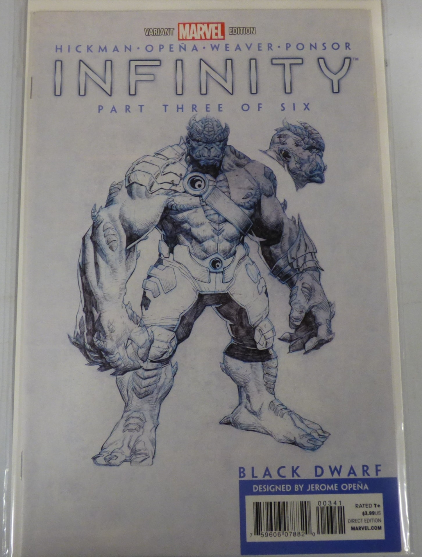 A comic book, a Variant Marvel Edition of Infinity Part Three of Six, featuring Black Dwarf designed by Jerome Opeña, rated T+ Direct Edition, priced at $3.99US.