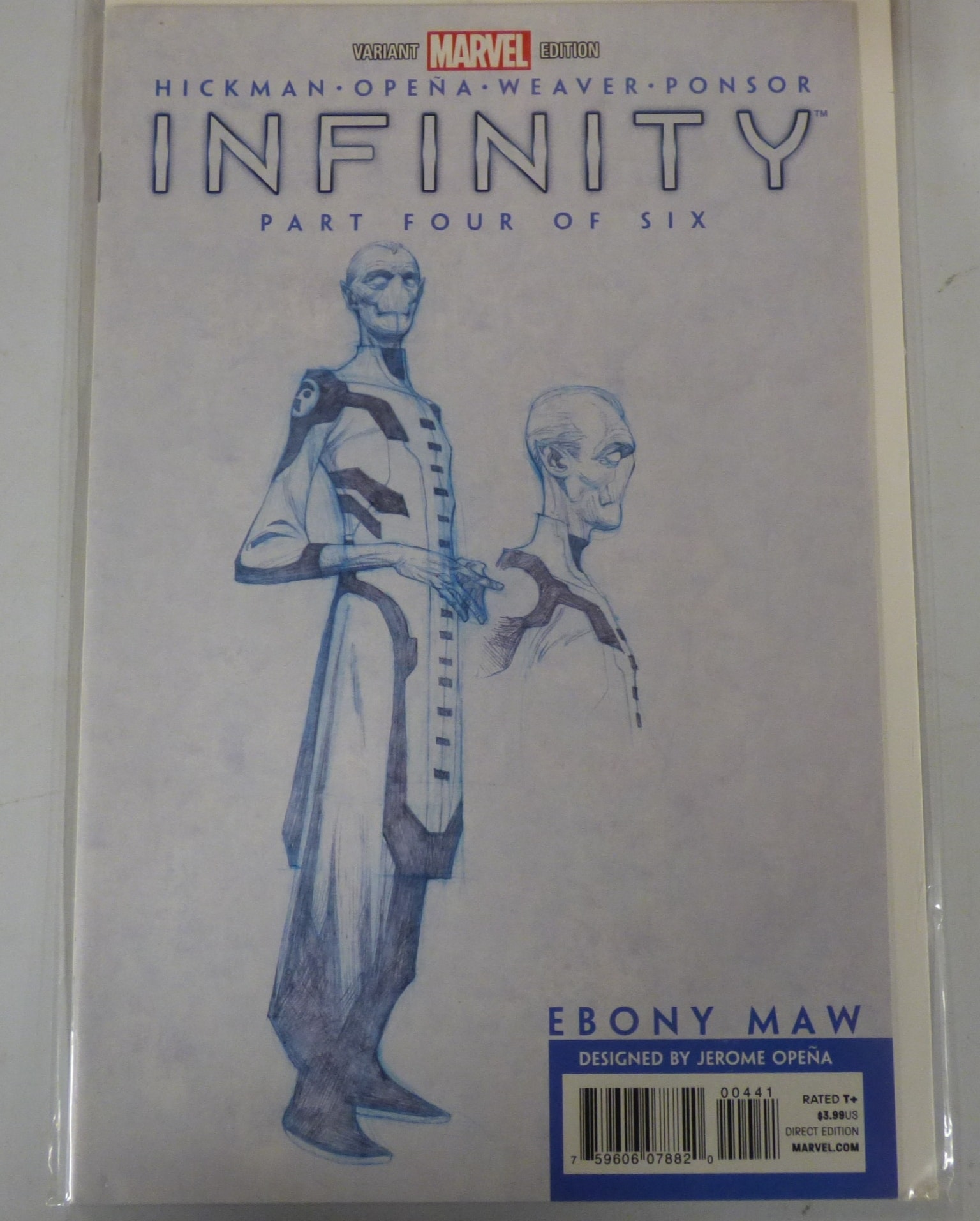 A Marvel comic book, ‘Infinity Part Four of Six, Variant Edition, ‘ features a white/light grey cover with blue and black illustrations of Ebony Maw, designed by Jerome Opeña, and is marked with ‘Hickman • Opeña • Weaver • Ponsor, ‘ and a $3.99US price.