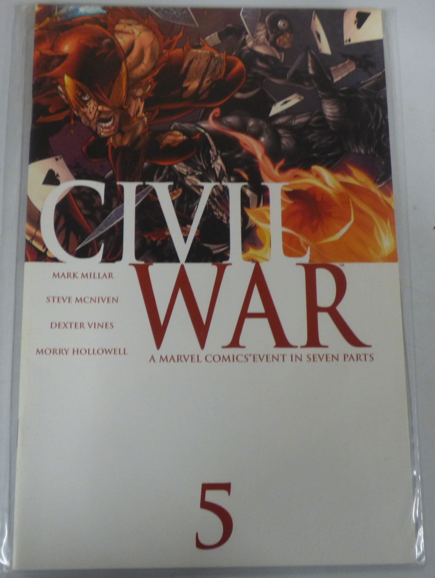 A Civil War comic book, issue #5, by Mark Millar and Steve McNiven, featuring red, orange, black, and white colours, described as “A Marvel Comics Event in Seven Parts”.