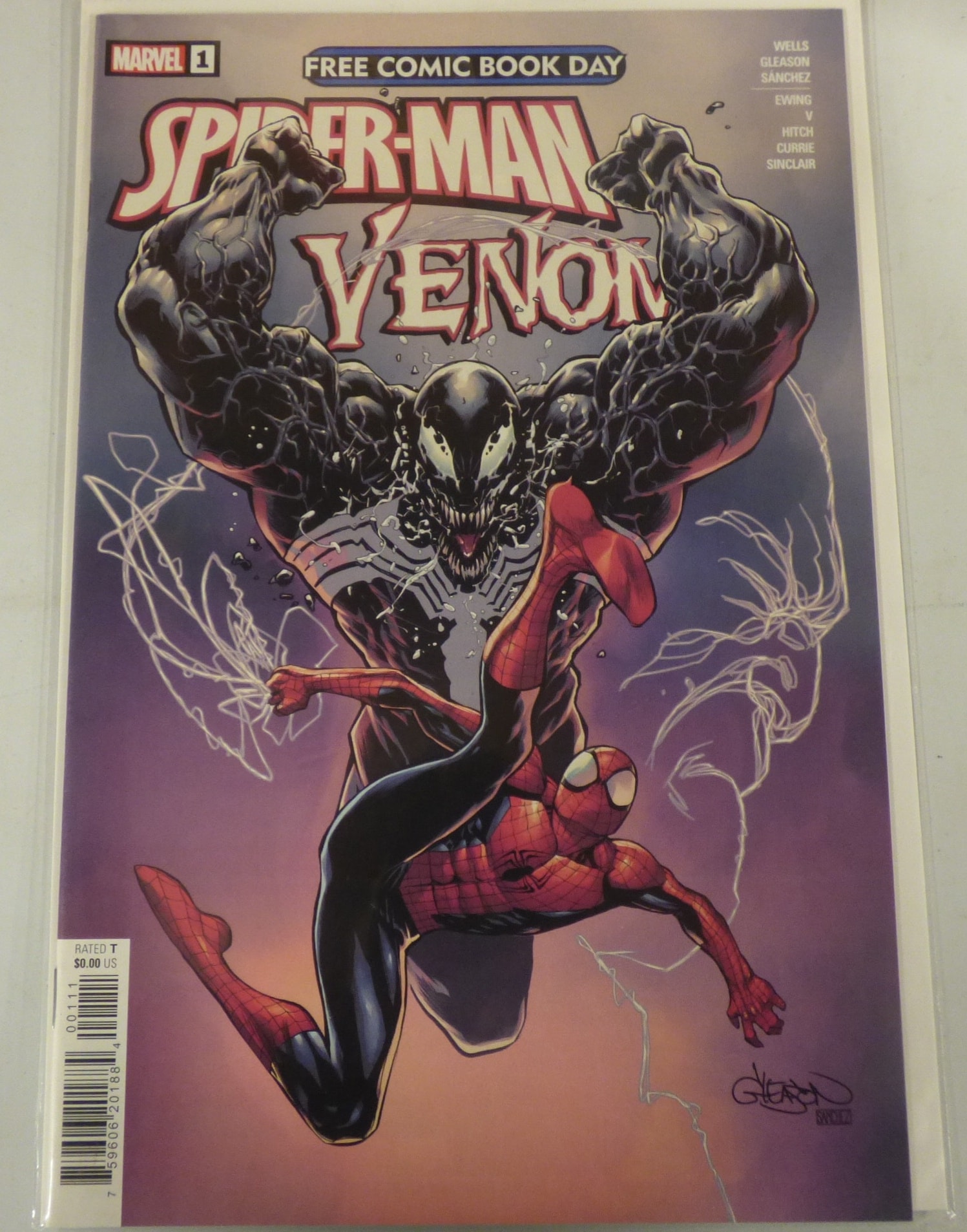 A Marvel Spider-Man Venom comic book, issue #1, from Free Comic Book Day 2021, featuring black, red, blue, and purple art, labeled ‘MARVEL 1’, ‘RATED T’, and priced ‘$0.00 US’, with a visible ‘GLEASON SANCHEZ’ signature.