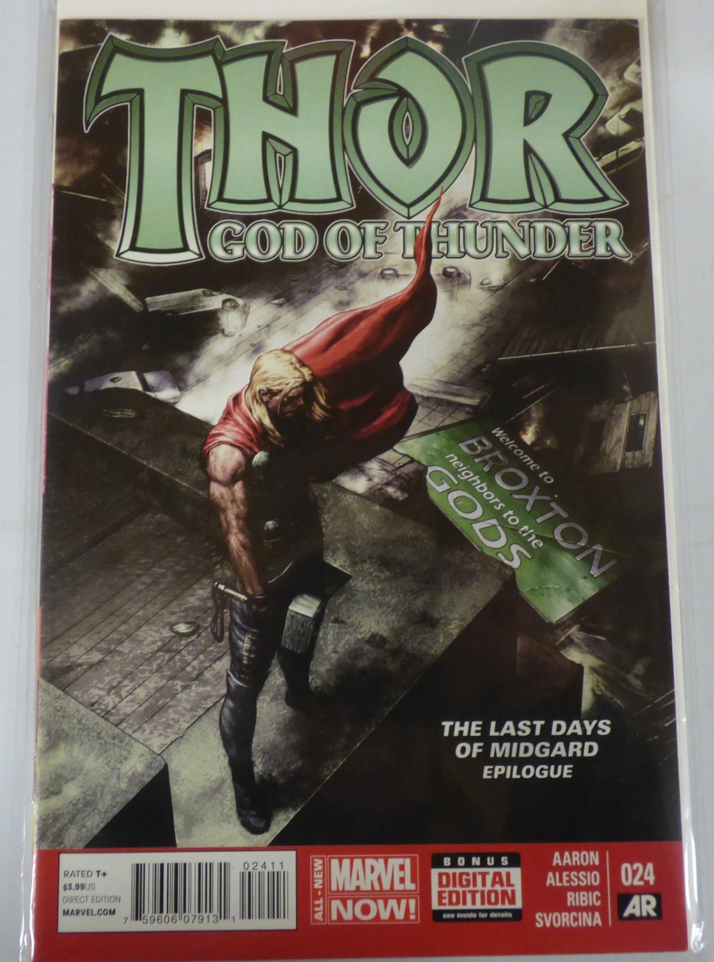 A comic book titled “THOR GOD OF THUNDER, ” issue #024, published by MARVEL NOW!, featuring a dark and grey cover with Thor in a red cape, labeled “THE LAST DAYS OF MIDGARD EPILOGUE” and “Welcome to BROXTON neighbors to the GODS, ” originally priced at $3.99US.