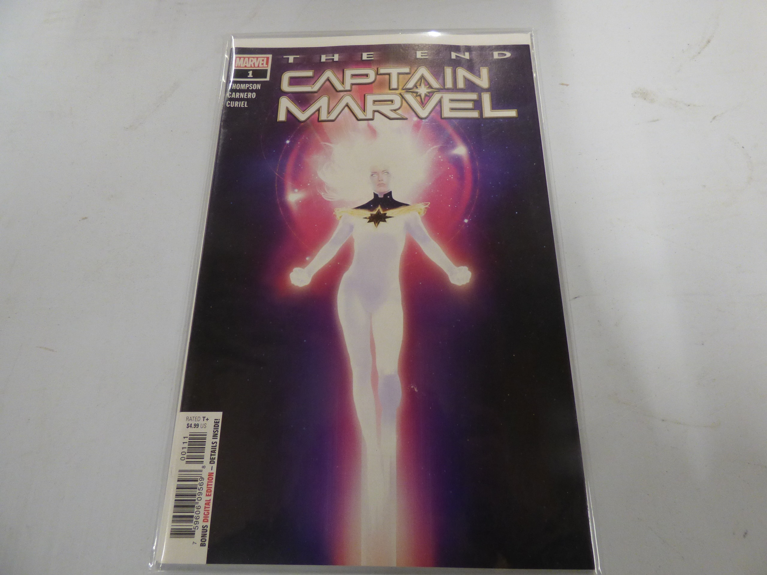 A Marvel comic book titled ‘THE END CAPTAIN MARVEL #1’, predominantly purple, pink, black, and white, marked ‘RATED T+’ and priced at $4.99 US, with a ‘BONUS DIGITAL EDITION’.