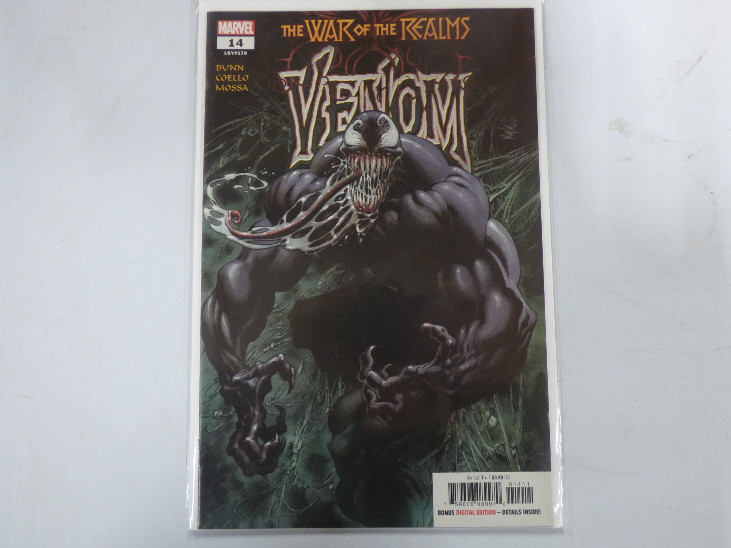 A Marvel Venom #14 (LGY#179) comic book, ‘THE WAR of THE REALMS, ‘ featuring a dark grey and white Venom character, with a $3.99 US price and ‘BONUS DIGITAL EDITION’ inscription.