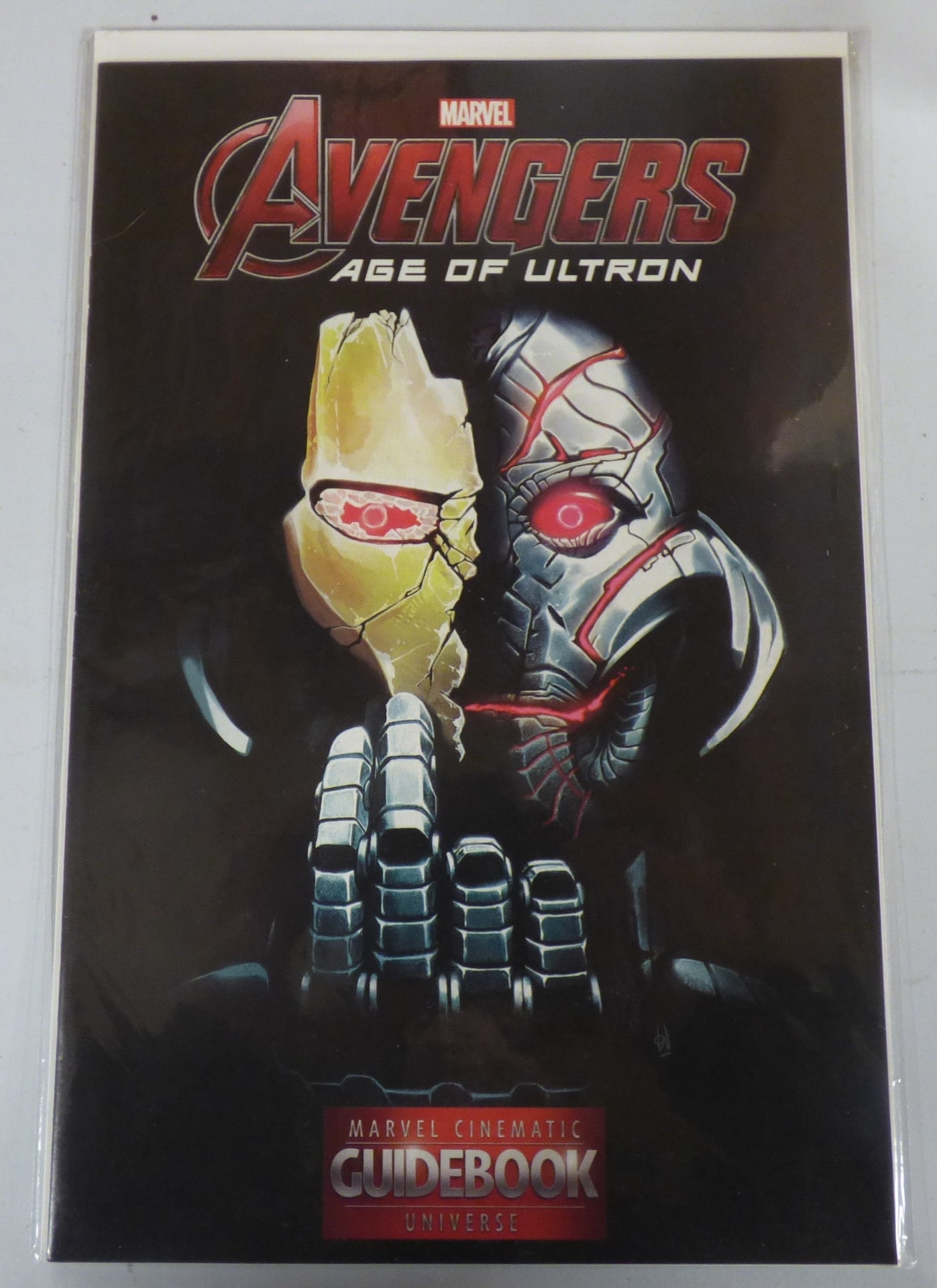 A Marvel Cinematic Universe Guidebook for ‘Avengers Age of Ultron’ with a dark cover featuring a split gold and silver metallic face.