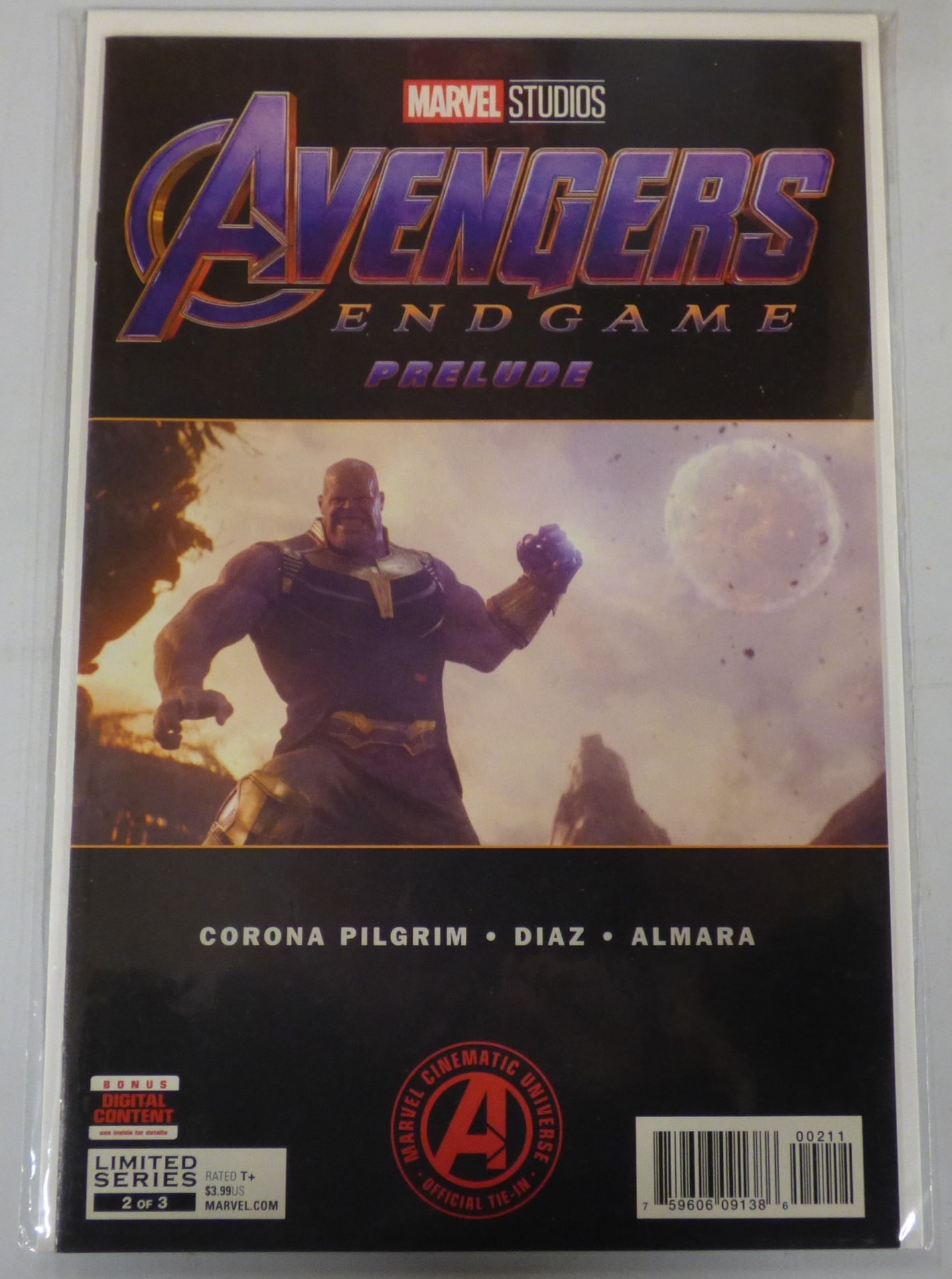 A Marvel Studios Avengers Endgame Prelude comic book, issue 2 of 3, featuring Thanos on the cover with black, purple, and gold accents, rated T+, an official Marvel Cinematic Universe tie-in, and originally priced at $3.99US.