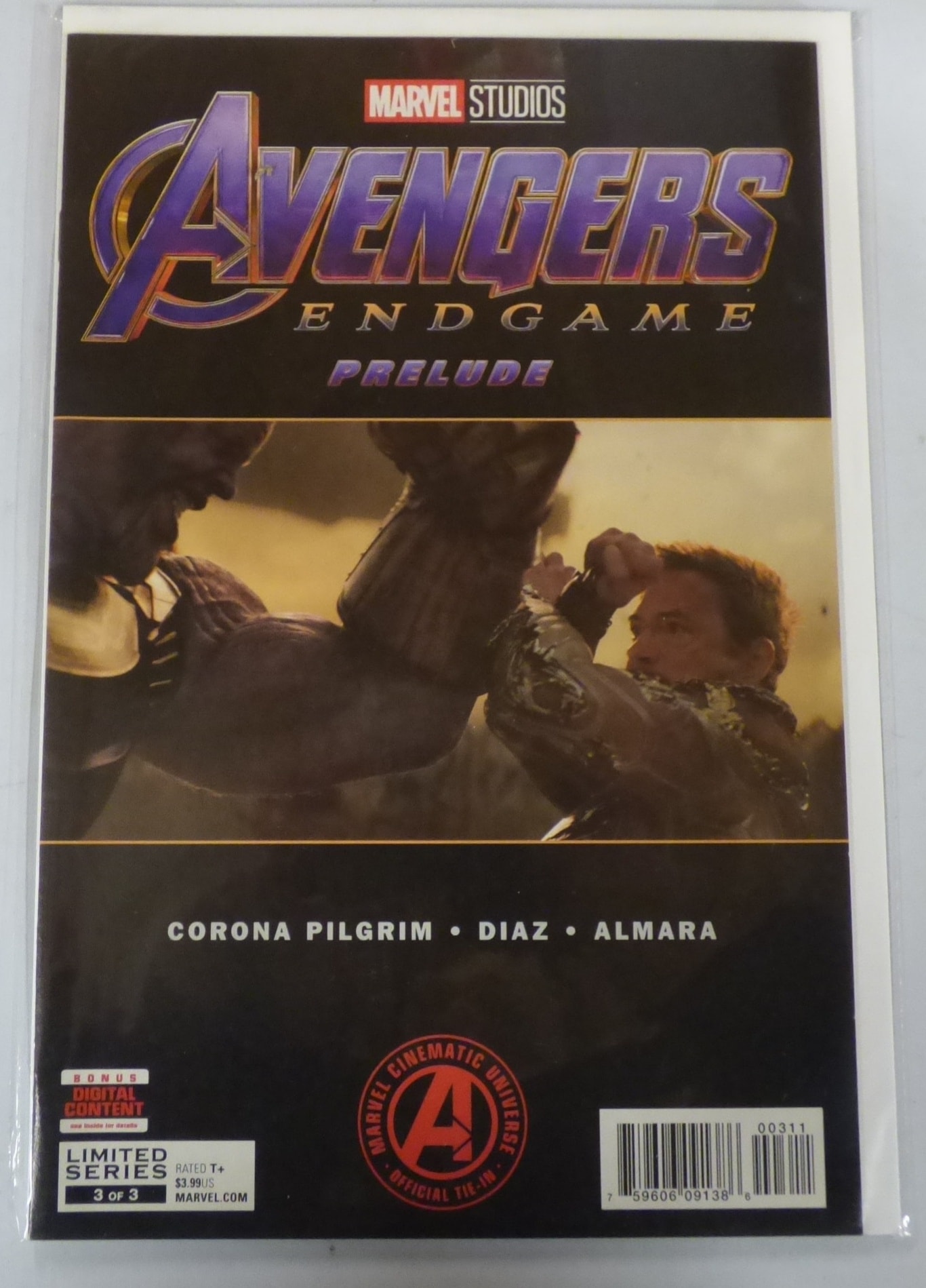 One Marvel Studios “Avengers Endgame Prelude” comic book, issue 3 of 3, featuring purple-skinned and human-like characters on its dark cover, labeled “Corona Pilgrim • Diaz • Almará” and priced at $3.99US.