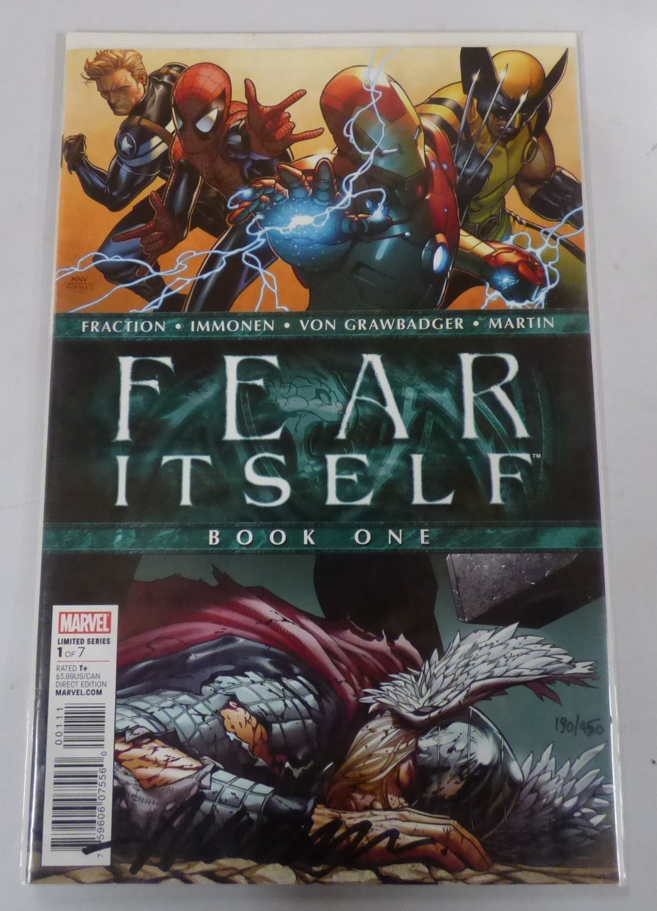 A multi-colored Marvel comic book, “Fear Itself Book One, ” Limited Series 1 of 7, featuring creators Fraction, Immonen, Von Grawbadger, and Martin, with a visible price of $3.99US/CAN, an “MNV Morales” mark, and a handwritten “190/456” inscription.