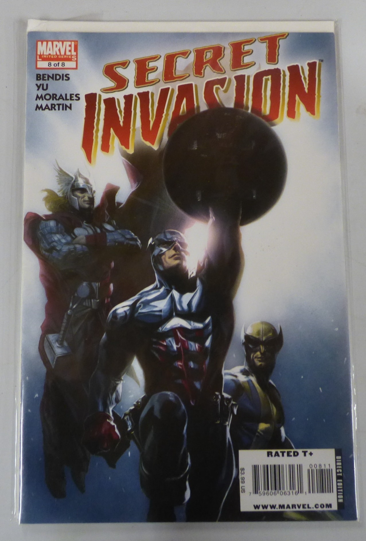 A Marvel comic book titled ‘SECRET INVASION’, issue 8 of 8, featuring characters in blue, red, white, and yellow, marked ‘MARVEL LIMITED SERIES’, ‘BENDIS YU MORALES MARTIN’, ‘RATED T+’, ‘DIRECT EDITION’, and priced at $3.99 US.