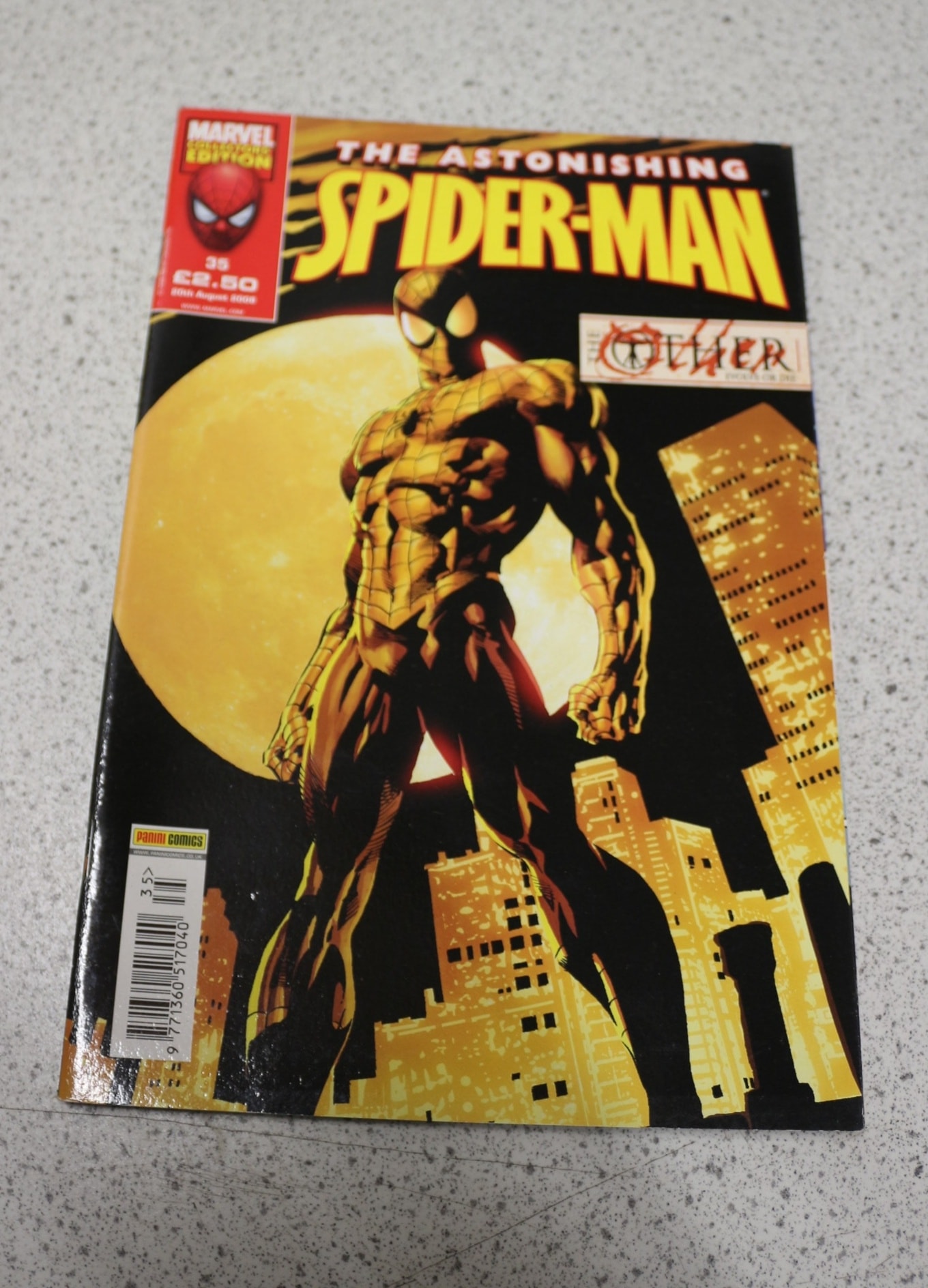 A Marvel Collector’s Edition comic book, ‘THE ASTONISHING SPIDER-MAN’ issue 35 by Panini Comics, dated 30th August 2006, with a black and yellow/gold cover featuring Spider-Man and a visible price of £2.50.