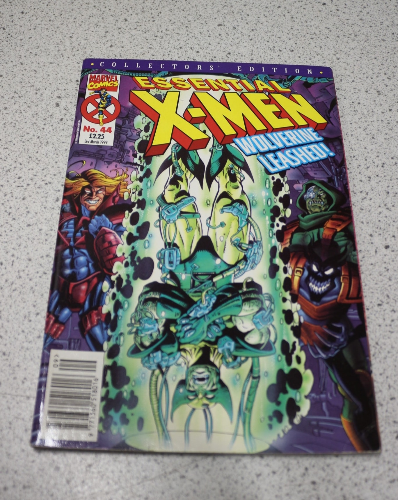 A multi-coloured comic book, “ESSENTIAL X-MEN” No. 44, a MARVEL COMICS “COLLECTORS’ EDITION” featuring “WOLVERINE LEASHED!” on the cover, published 3rd March 1999 and priced at £2.25.