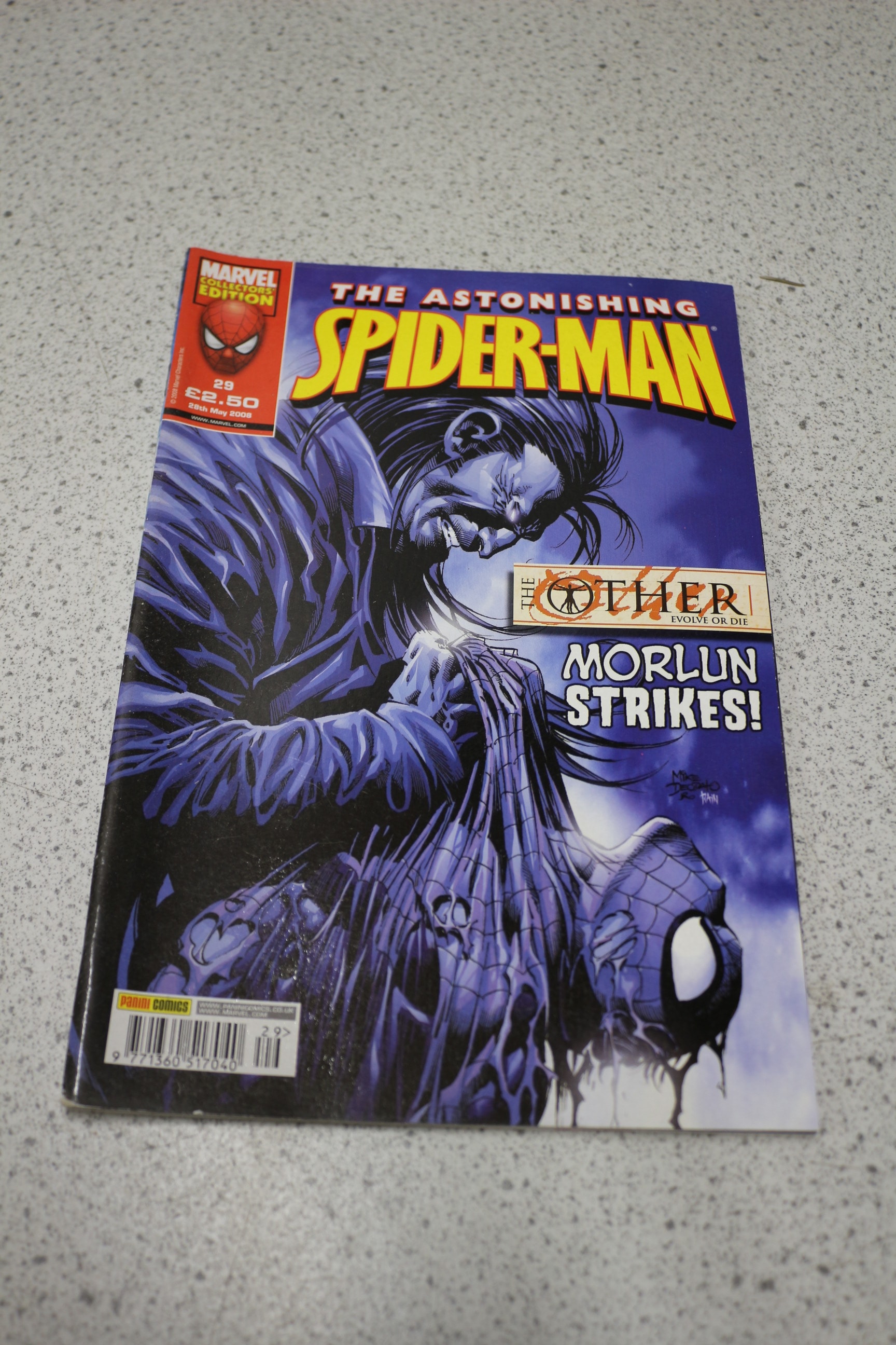 A comic book, ‘The Astonishing Spider-Man’ issue 29, with a blue and purple cover featuring Morlun and a tattered Spider-Man, marked ‘MARVEL COLLECTORS EDITION’, ‘THE OTHER: EVOLVE OR DIE’, ‘MORLUN STRIKES!’, ‘PANINI COMICS’, dated 28th May 2008, and priced at £2.50.