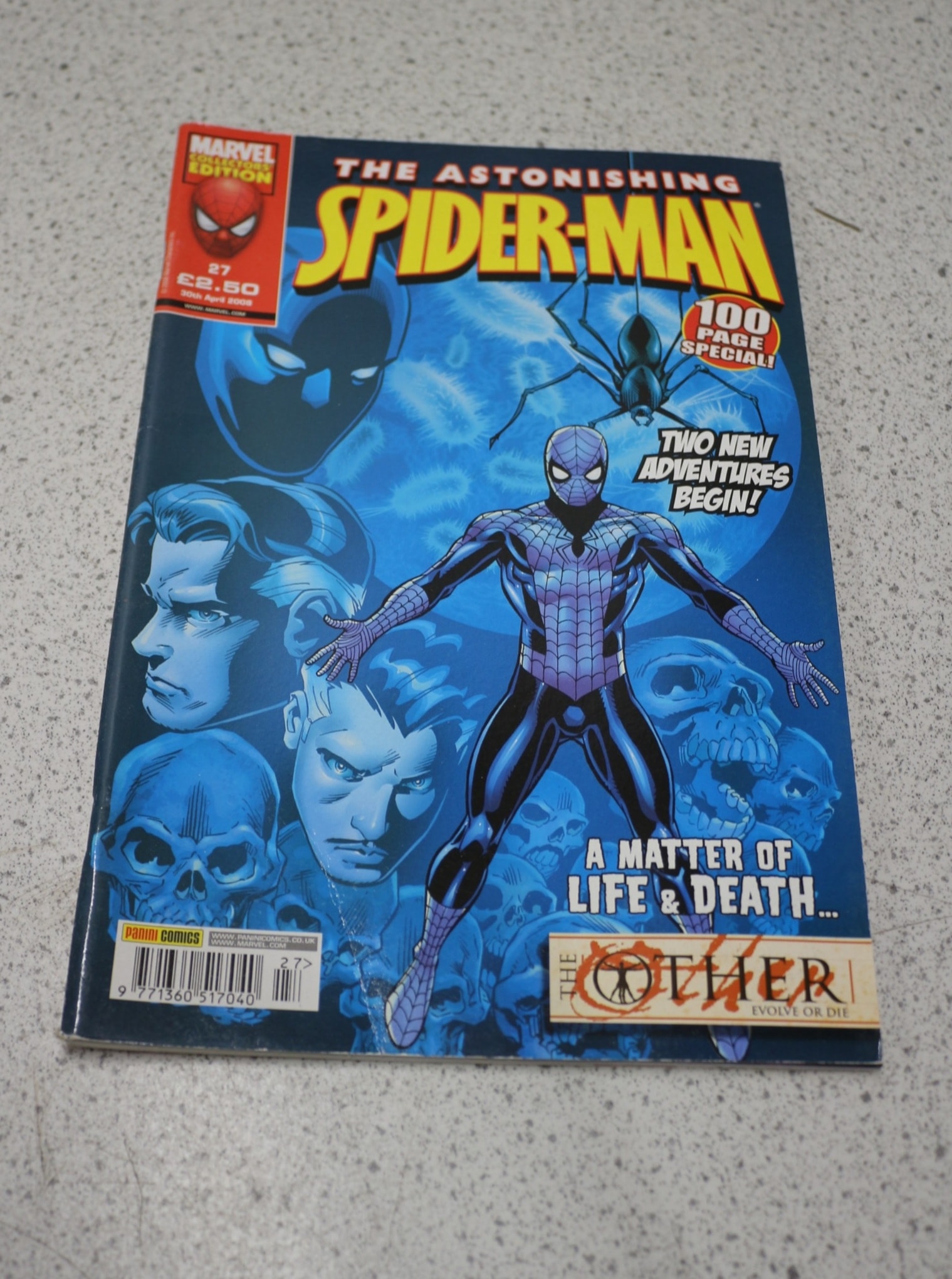 A primarily blue, yellow, and red comic book titled ‘The Astonishing Spider-Man’, issue 27, featuring Spider-Man, marked ‘MARVEL COLLECTORS EDITION’, ‘100 PAGE SPECIAL!’, ‘A MATTER OF LIFE & DEATH…’, ‘THE OTHER EVOLVE OR DIE’, with a ‘PANINI COMICS’ logo and barcode, dated 30th April 2008.