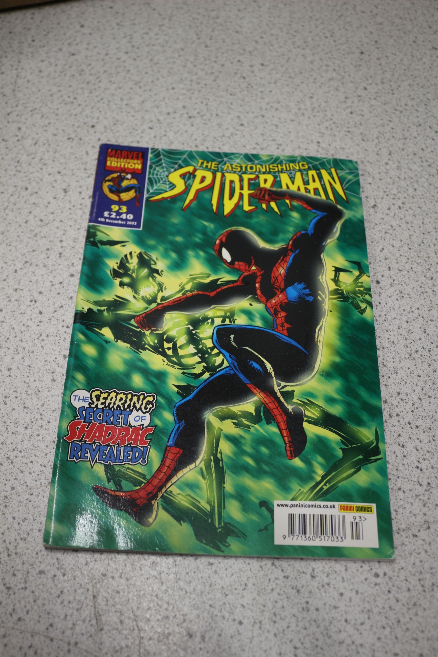 A green, black, red, and blue Marvel Collectors Edition comic book, issue 93, ‘THE ASTONISHING SPIDER-MAN’, dated 4th December 2002, originally priced £2.40.