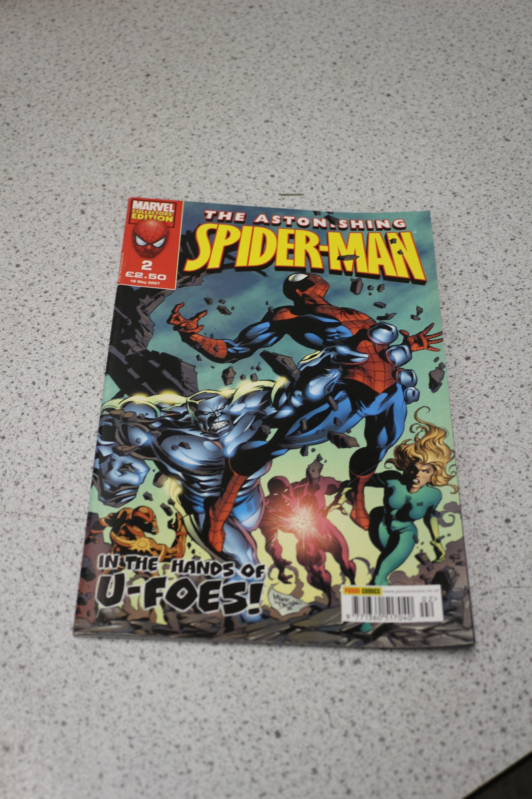 A predominantly red, blue, and yellow comic book, ‘THE ASTONISHING SPIDER-MAN’ #2, a ‘MARVEL COLLECTORS EDITION’ by ‘PANINI COMICS’, dated 16 May 2007, with the inscription ‘IN THE HANDS OF U-FOES!’.