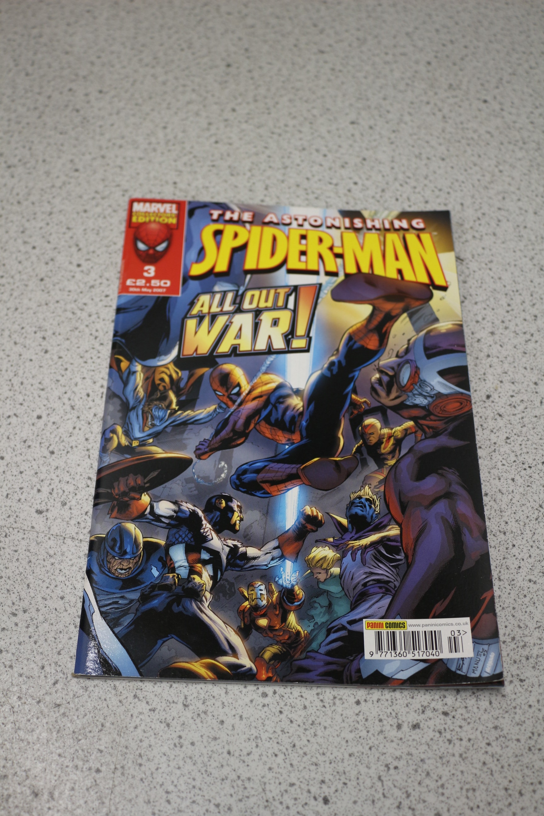 A multi-coloured comic book, “THE ASTONISHING SPIDER-MAN ALL OUT WAR!”, issue #3, a Marvel Collectors Edition by Panini Comics, published 20th May 2007.