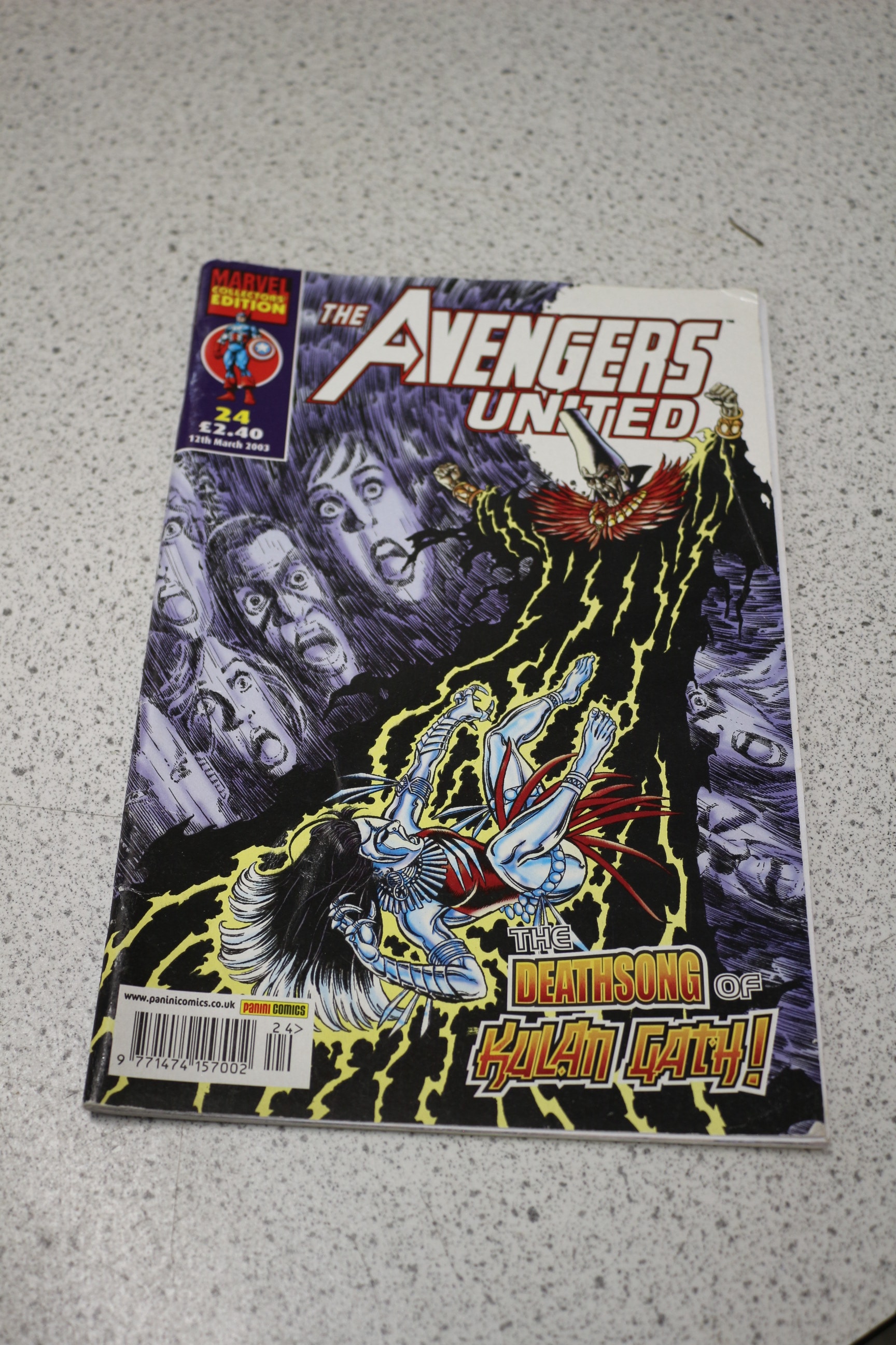 A multicoloured comic book, ‘THE AVENGERS UNITED’ Marvel Collectors Edition, issue 24, ‘The Deathsang of Kulan Gath!’, published by Panini Comics on 12th March 2003, with a visible price of £2.40.