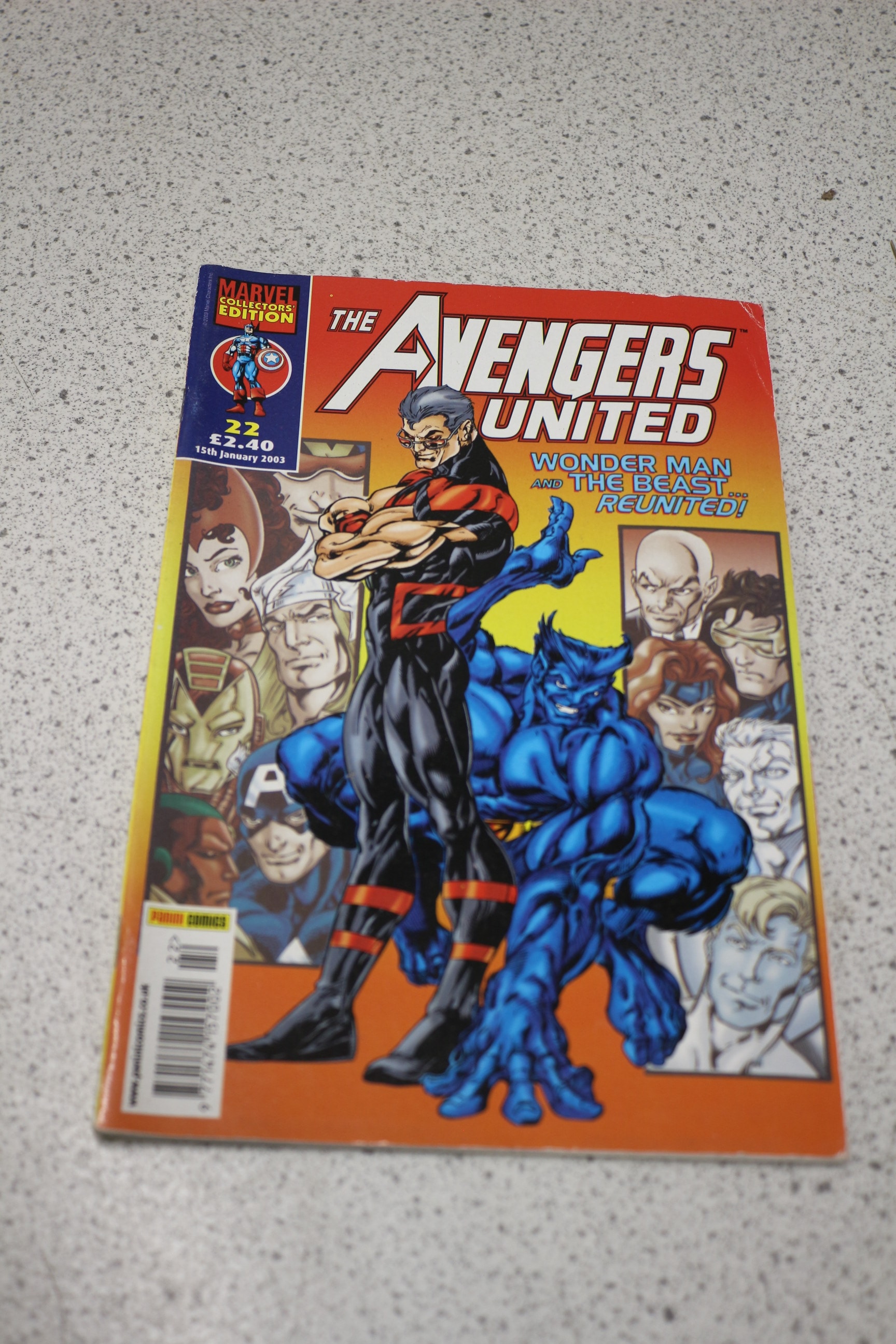 A Marvel comic book titled “The Avengers United”, a Panini Comics Marvel Collectors’ Edition issue 22, predominantly orange and blue, featuring Wonder Man and The Beast, priced at £2.40 and dated 15th January 2003.
