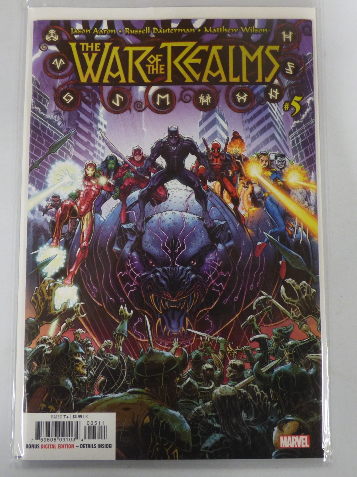 A colourful comic book titled “THE WAR OF THE REALMS #5” by Jason Aaron, Russell Dauterman, and Matthew Wilson, published by MARVEL, rated T+, priced at $4.99 US, and includes a “BONUS DIGITAL EDITION”.