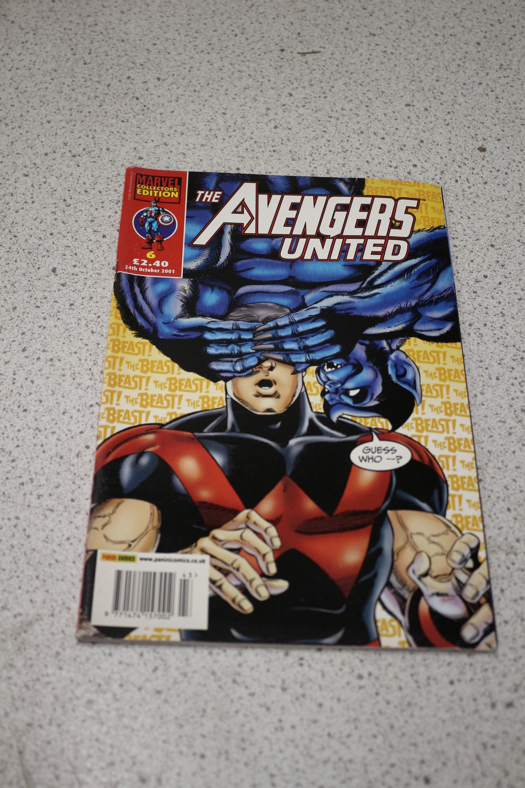 A multi-coloured Marvel Collectors’ Edition comic book, “The Avengers United” issue 6, dated 24th October 2001, published by Panini Comics, featuring blue, red, black, and yellow imagery with “© 2001 Marvel Characters, Inc.”, “GUESS WHO –?”, and repeated “THE BEAST!”.