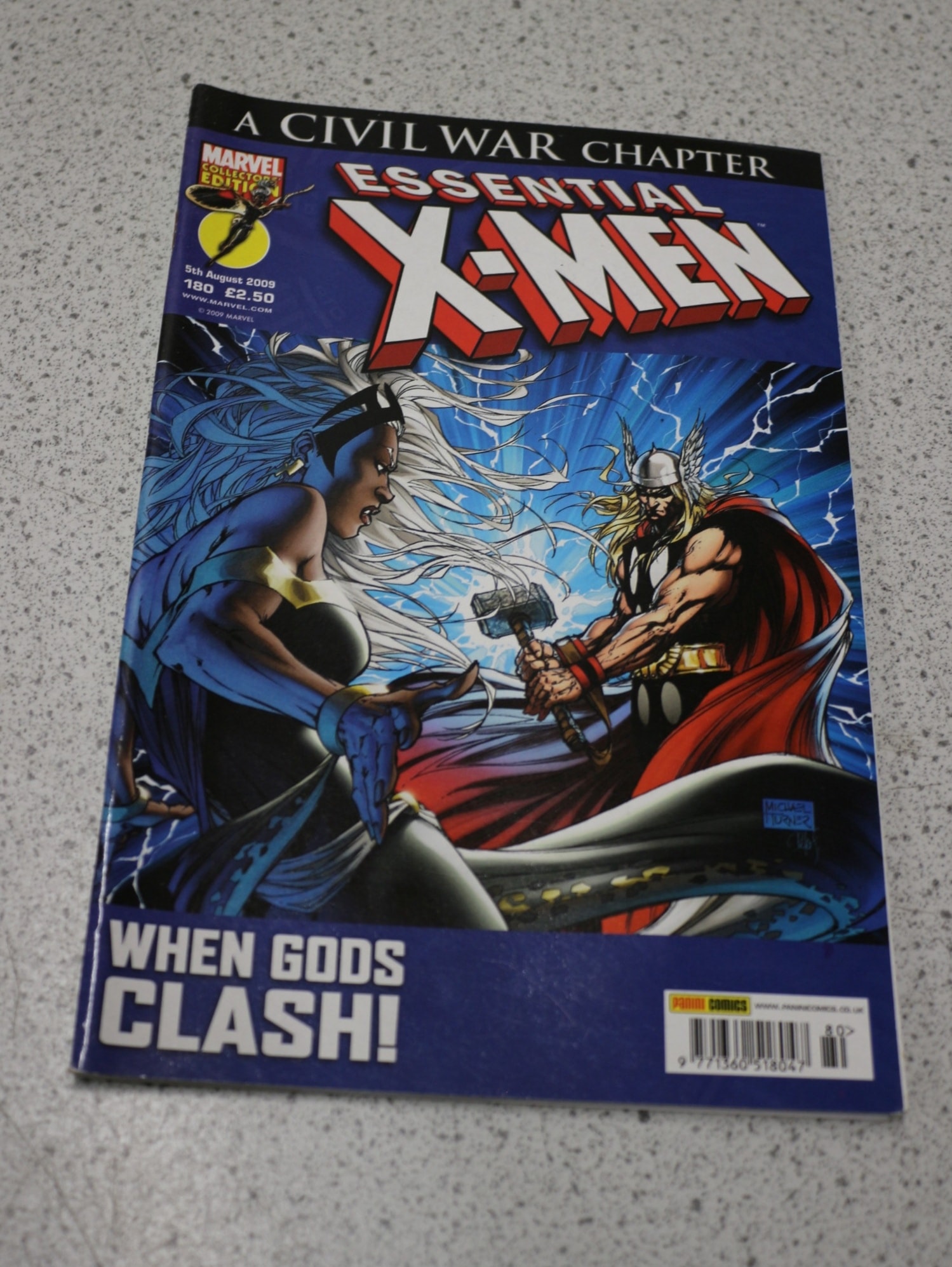 One comic book, “A CIVIL WAR CHAPTER ESSENTIAL X-MEN” (Marvel Collector’s Edition, issue 180, 2009), featuring Storm and Thor on a blue, red, and white cover with “WHEN GODS CLASH!” and Michael Turner’s signature, priced at £2.50.