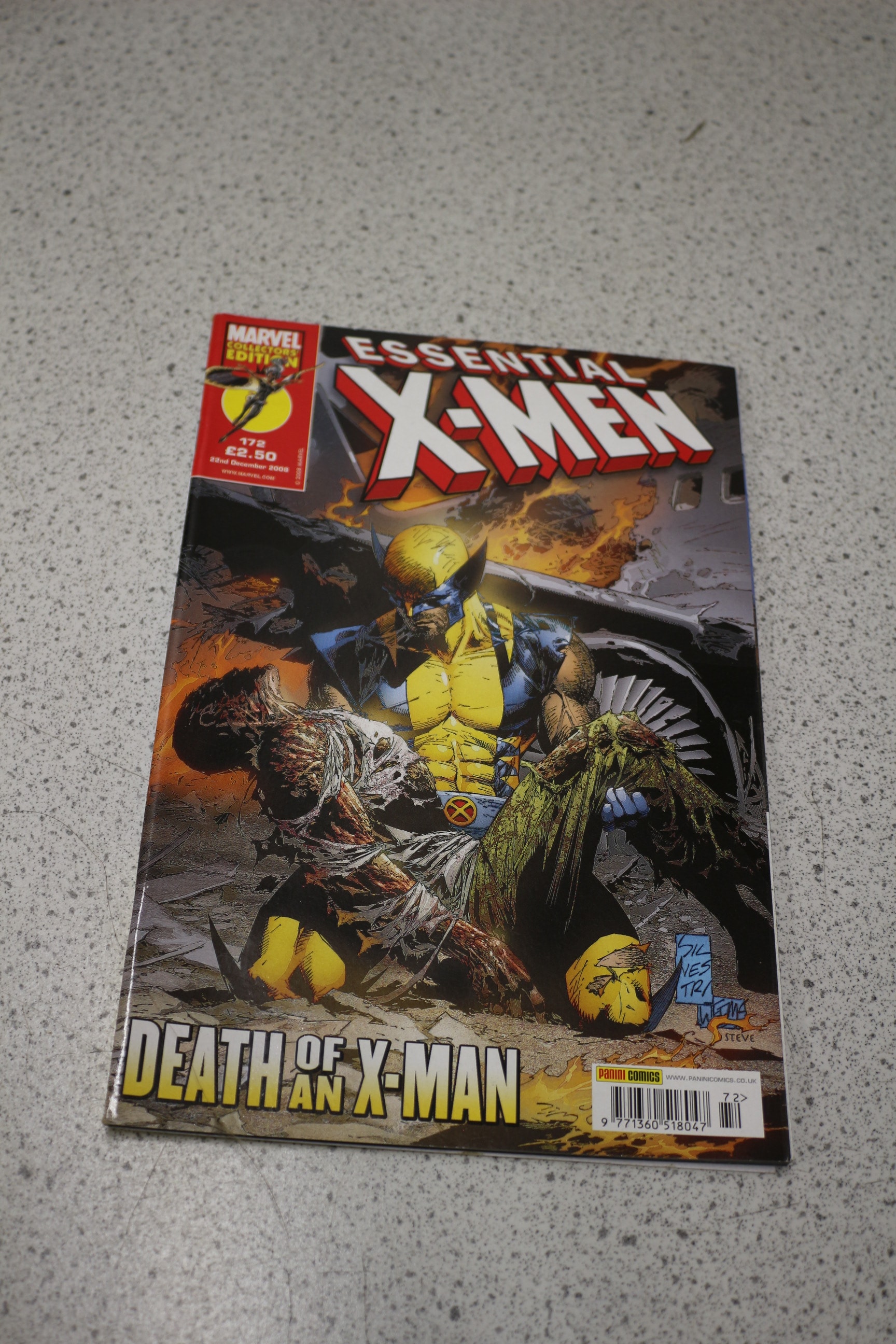A multi-coloured Marvel Essential X-Men comic book, issue #172, titled “Death of an X-Man”, featuring Wolverine and a deceased character on the cover, with “MARVEL COLLECTORS EDITION” and “panini comics” branding, dated 22nd December 2008.