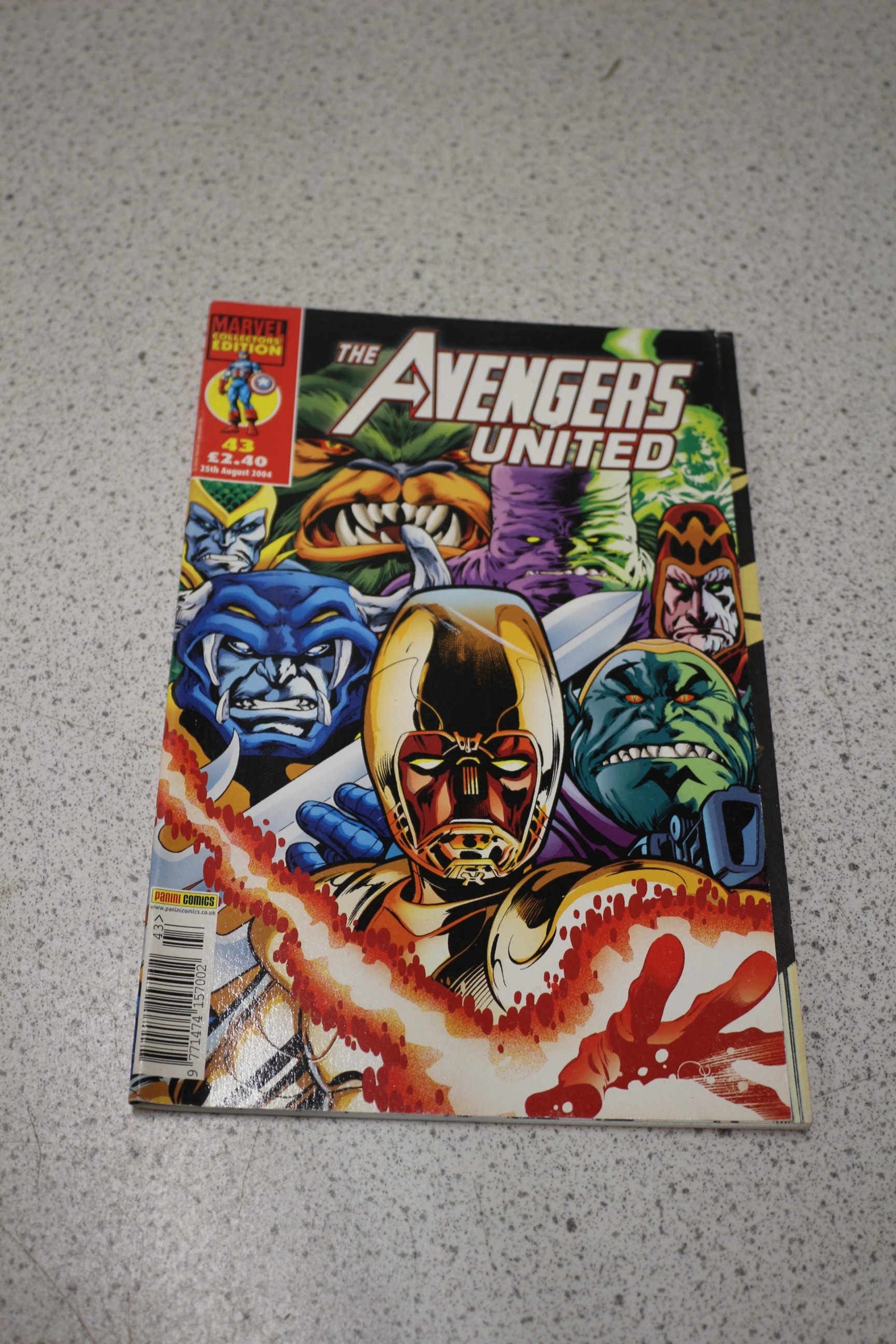 A multi-coloured comic book, ‘The Avengers United’ #43, a Marvel Collectors Edition by Panini Comics, dated 25th August 2004, featuring various characters including a prominent gold figure.