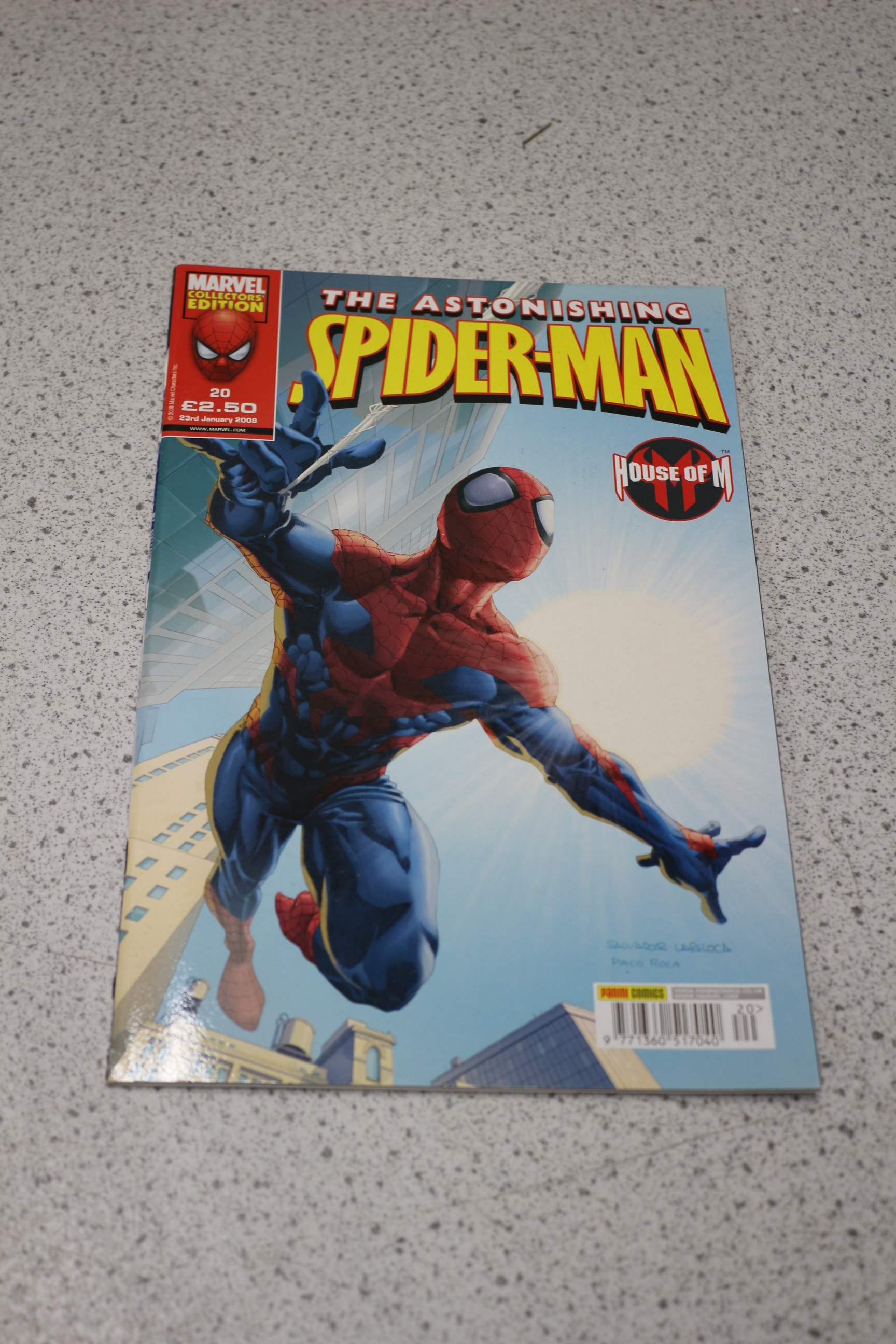 A single ‘Marvel Collectors’ Edition’ comic book, ‘The Astonishing Spider-Man’ issue 20, featuring Spider-Man in red and blue, with ‘HOUSE OF M’ branding, published by Panini Comics on 23rd January 2008.