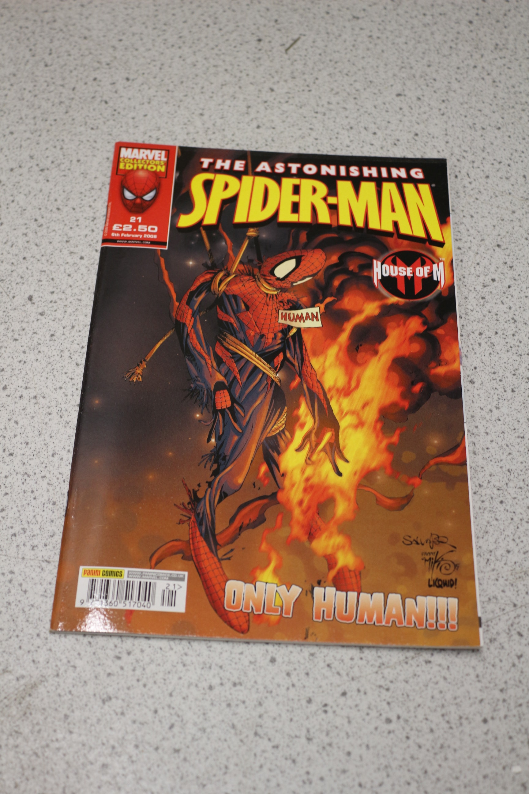 A multi-coloured comic book, ‘THE ASTONISHING SPIDER-MAN’, a ‘MARVEL COLLECTORS EDITION’ from ‘PANINI COMICS’, featuring ‘HOUSE OF M’ and ‘ONLY HUMAN!!!’ on the cover with a character bearing ‘HUMAN’ on its chest, dated 6th February 2008 and originally priced at £2.50.