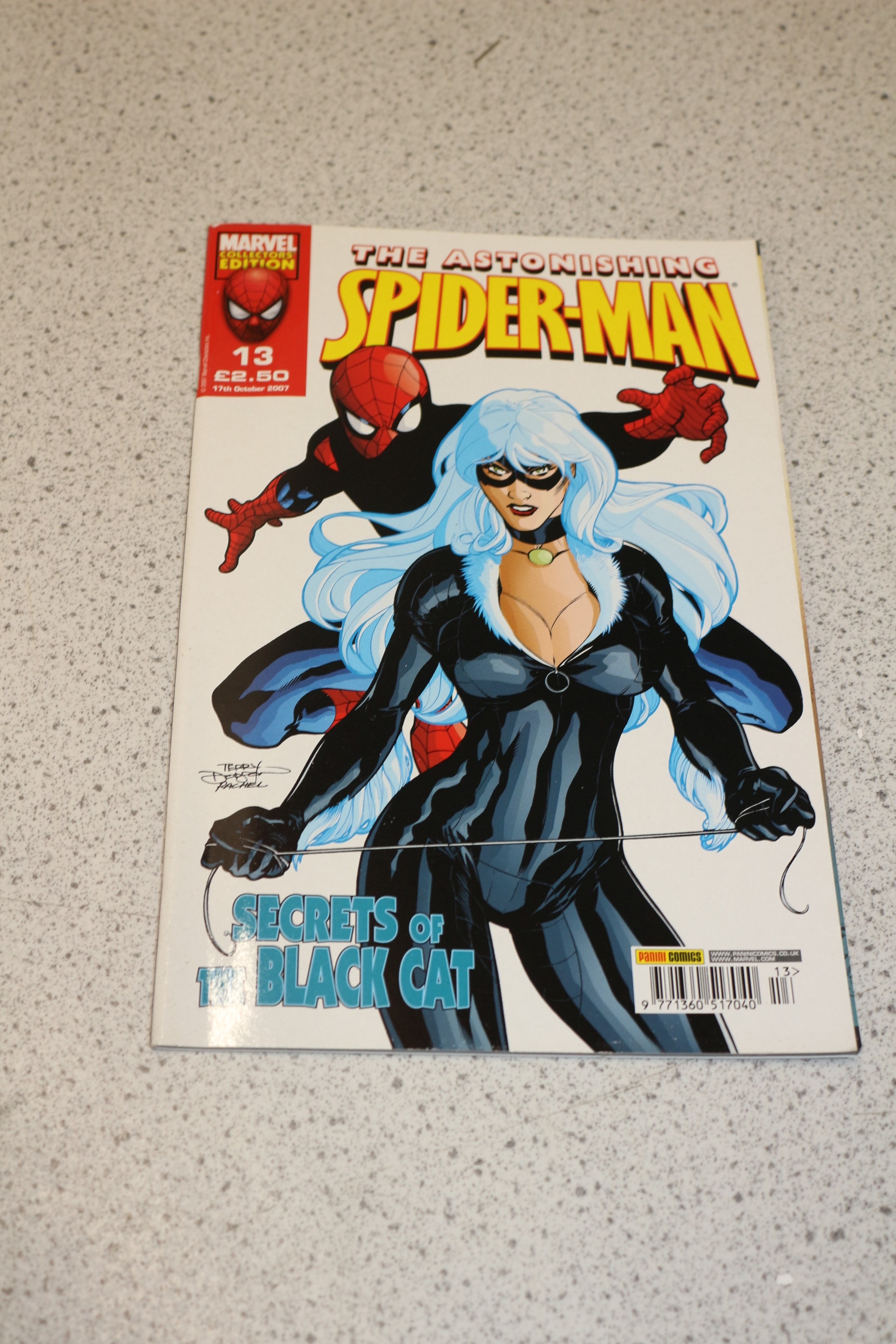 One Marvel Collectors Edition comic book, “The Astonishing Spider-Man” issue 13, dated 17th October 2007, features Spider-Man and Black Cat on a red, black, and light blue cover with “SECRETS OF THE BLACK CAT” and “panini comics” text.