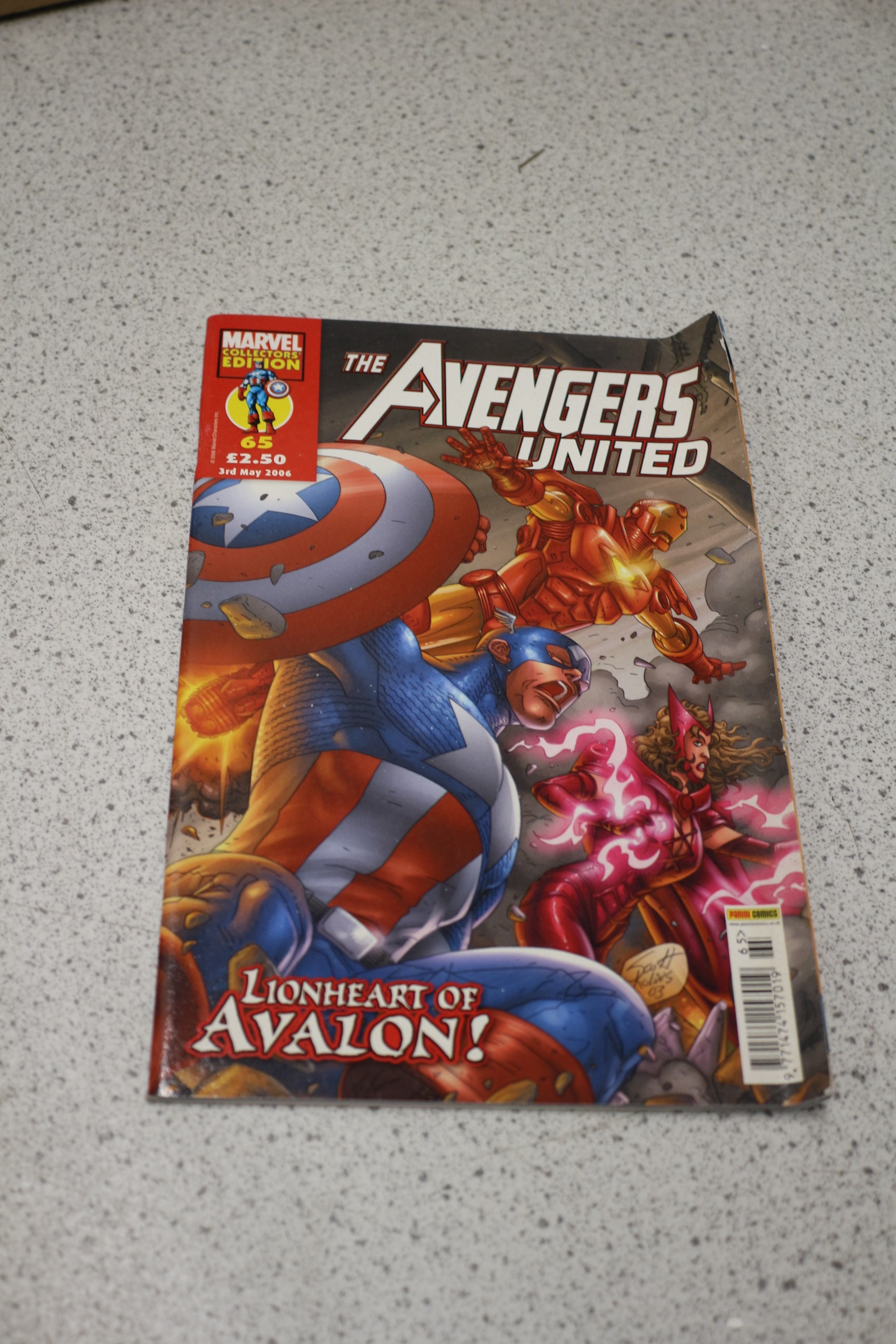 A multi-coloured Marvel comic book titled ‘THE AVENGERS UNITED: LIONHEART OF AVALON!’, identified as ‘MARVEL COLLECTORS’ EDITION’ #65, published 3rd May 2006, with a ‘PANINI COMICS’ brand mark and ‘Scott Kolins 03’ signature, originally priced at £2.50.