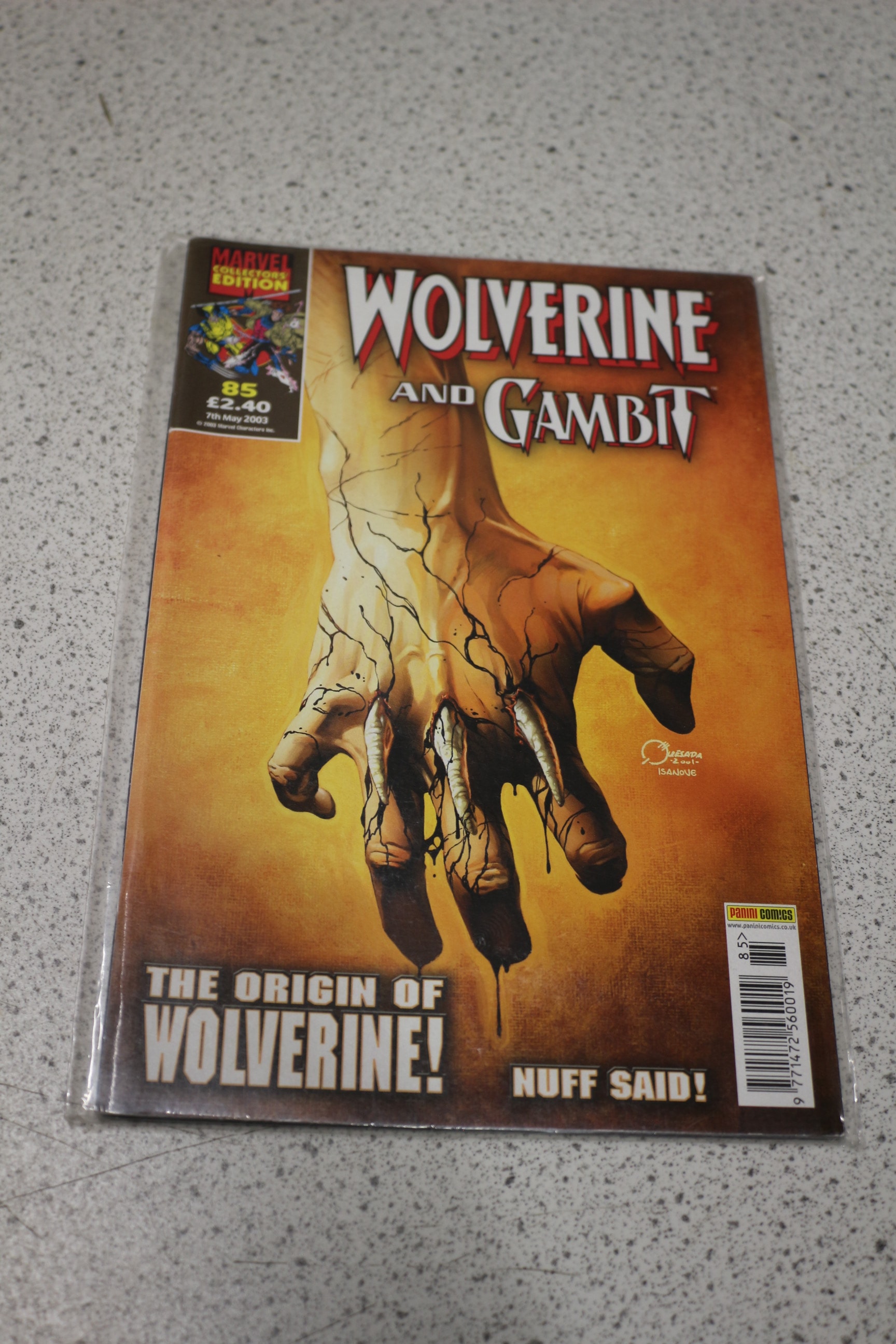 A Marvel Collectors Edition comic book titled “Wolverine and Gambit: The Origin of Wolverine!”, primarily brown, orange, and yellow, featuring “Panini Comics” branding, the inscription “RESADA -2001- ISANOVE, ” and dated 7th May 2003.