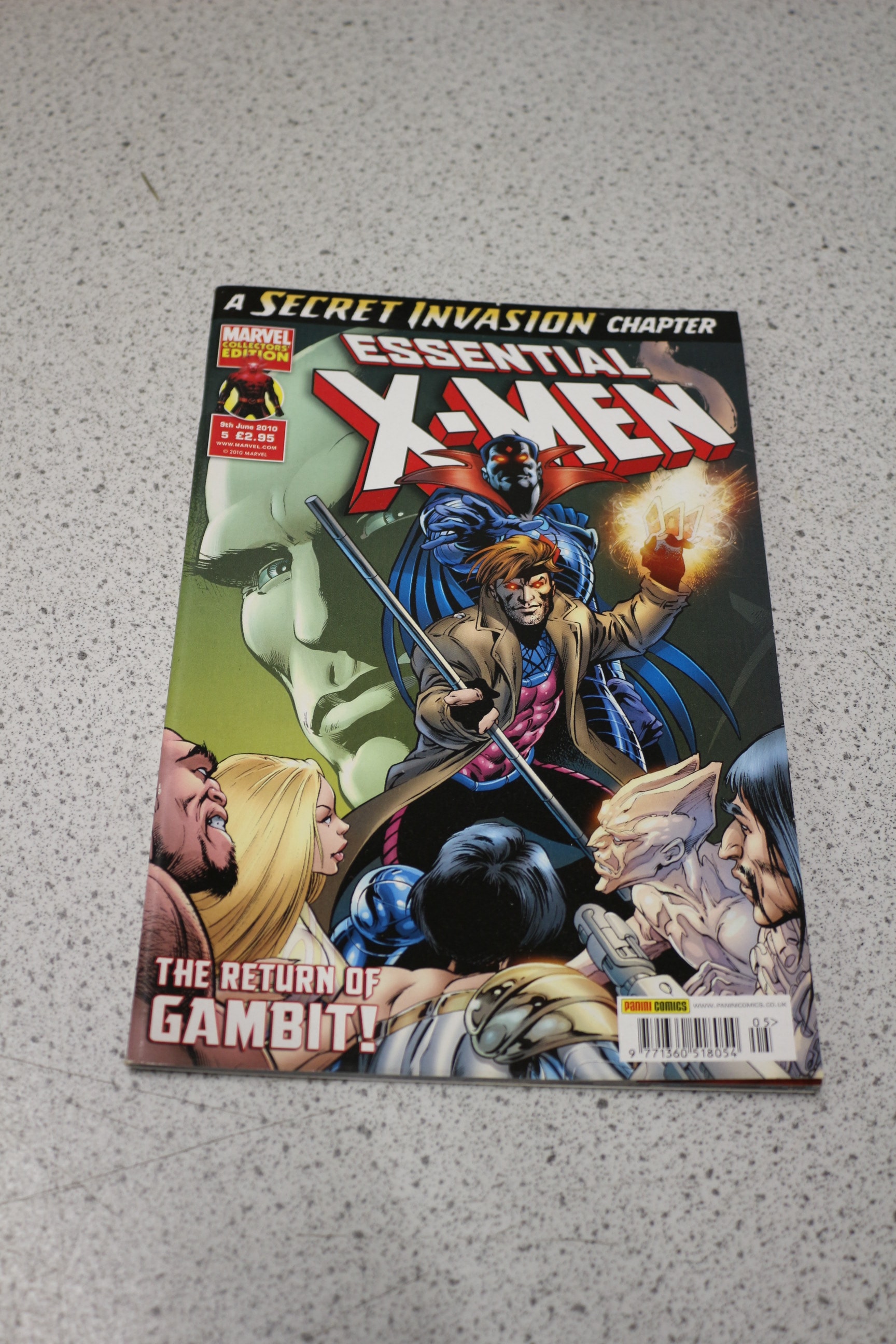 A multi-coloured comic book titled ‘A SECRET INVASION CHAPTER ESSENTIAL X-MEN: THE RETURN OF GAMBIT!’, a Marvel Collectors’ Edition published on 9th June 2010 by Panini Comics, priced at £2.95, and © 2010 MARVEL.