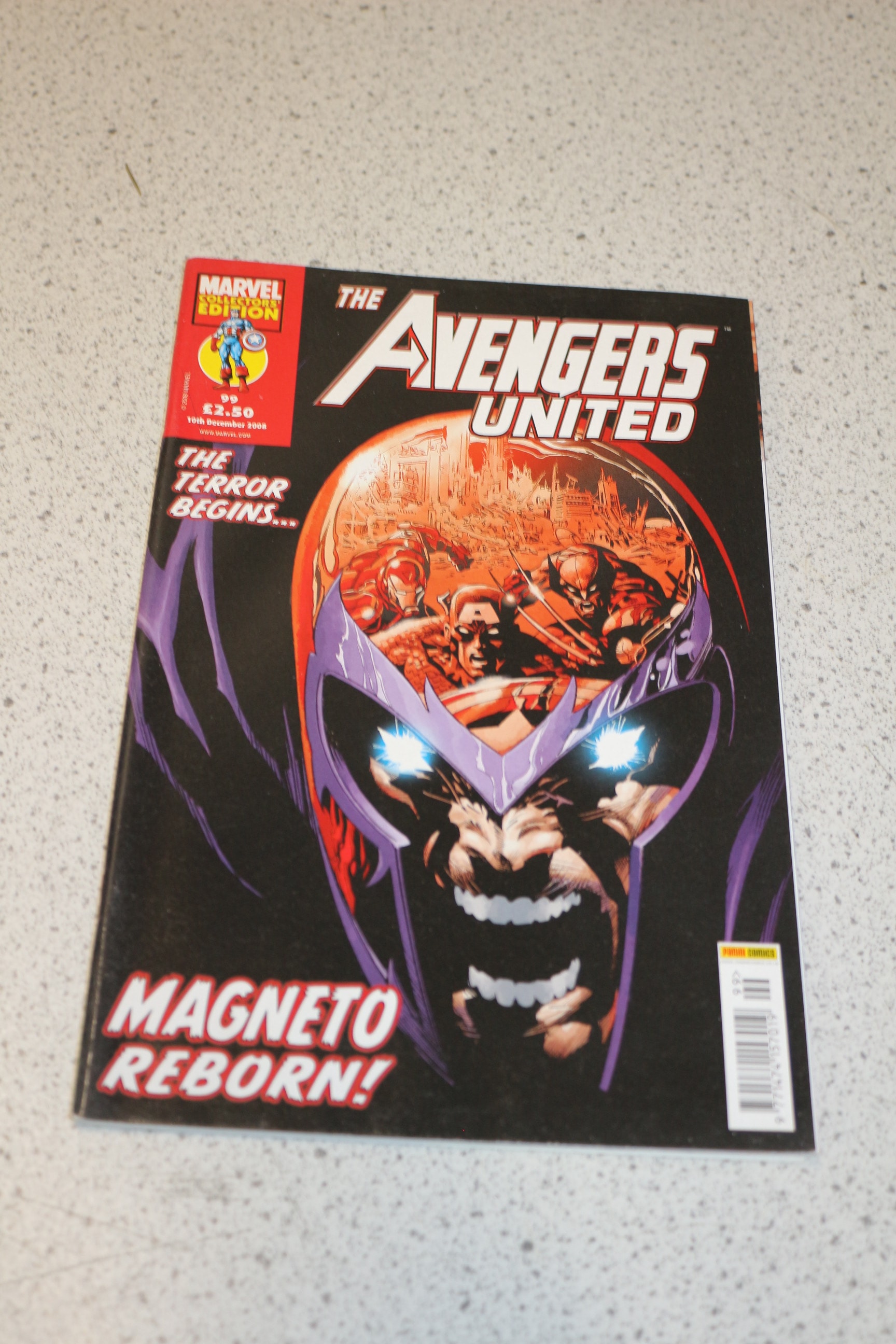 A black, red, purple, and orange Marvel Collectors Edition: The Avengers United comic book, © 2008 Marvel by Panini Comics, released 10th December 2008 for £2.50, featuring Magneto, Iron Man, Captain America, and Wolverine on the cover.