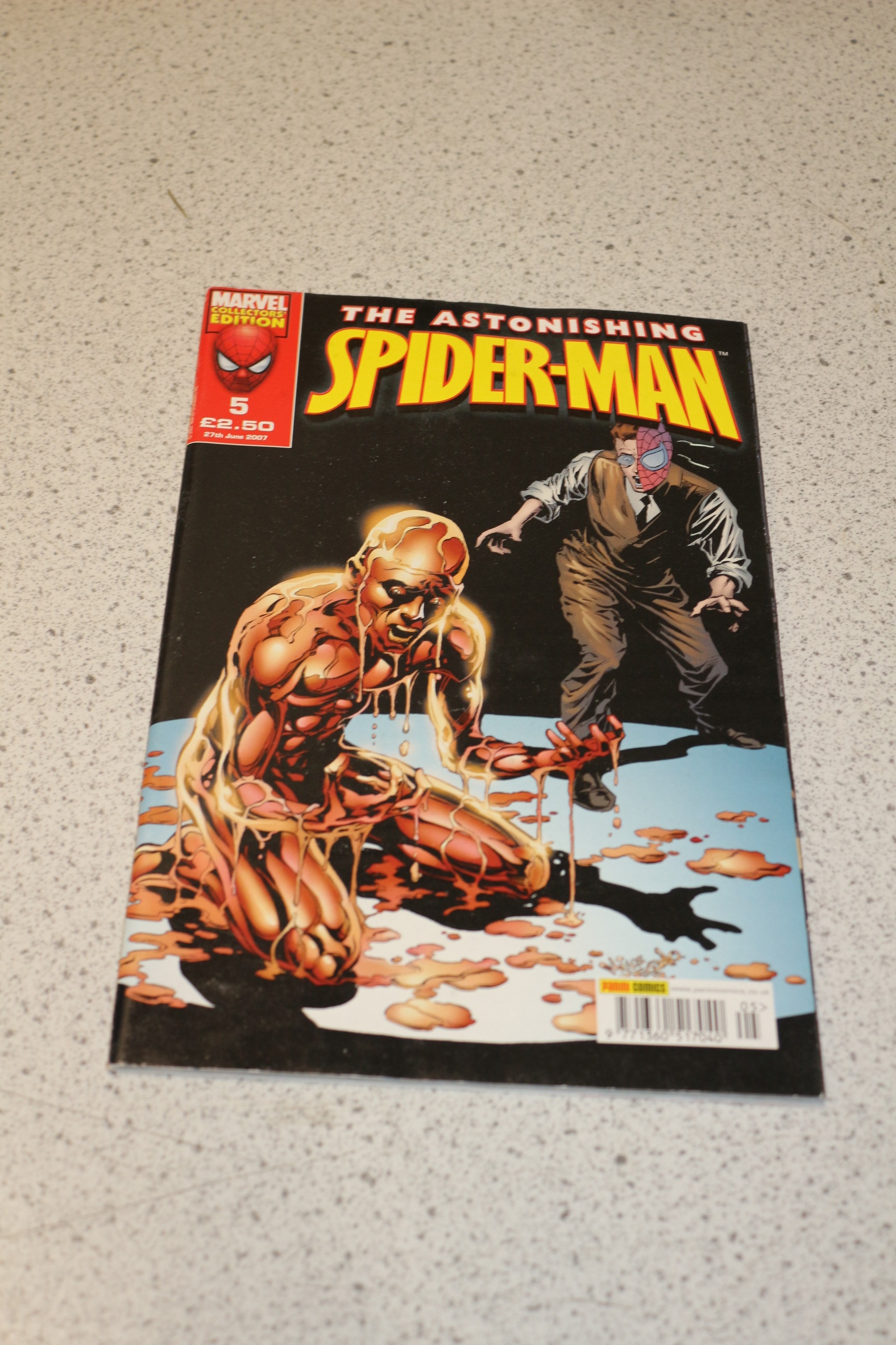 A single comic book, “THE ASTONISHING SPIDER-MAN, ” issue number 5, with a black, yellow, and red cover depicting a figure covered in an orange substance and another in a suit with a half-Spider-Man mask, labelled “MARVEL COLLECTORS EDITION” and “PANINI COMICS, ” priced at £2.50 and dated 27th June 2007.