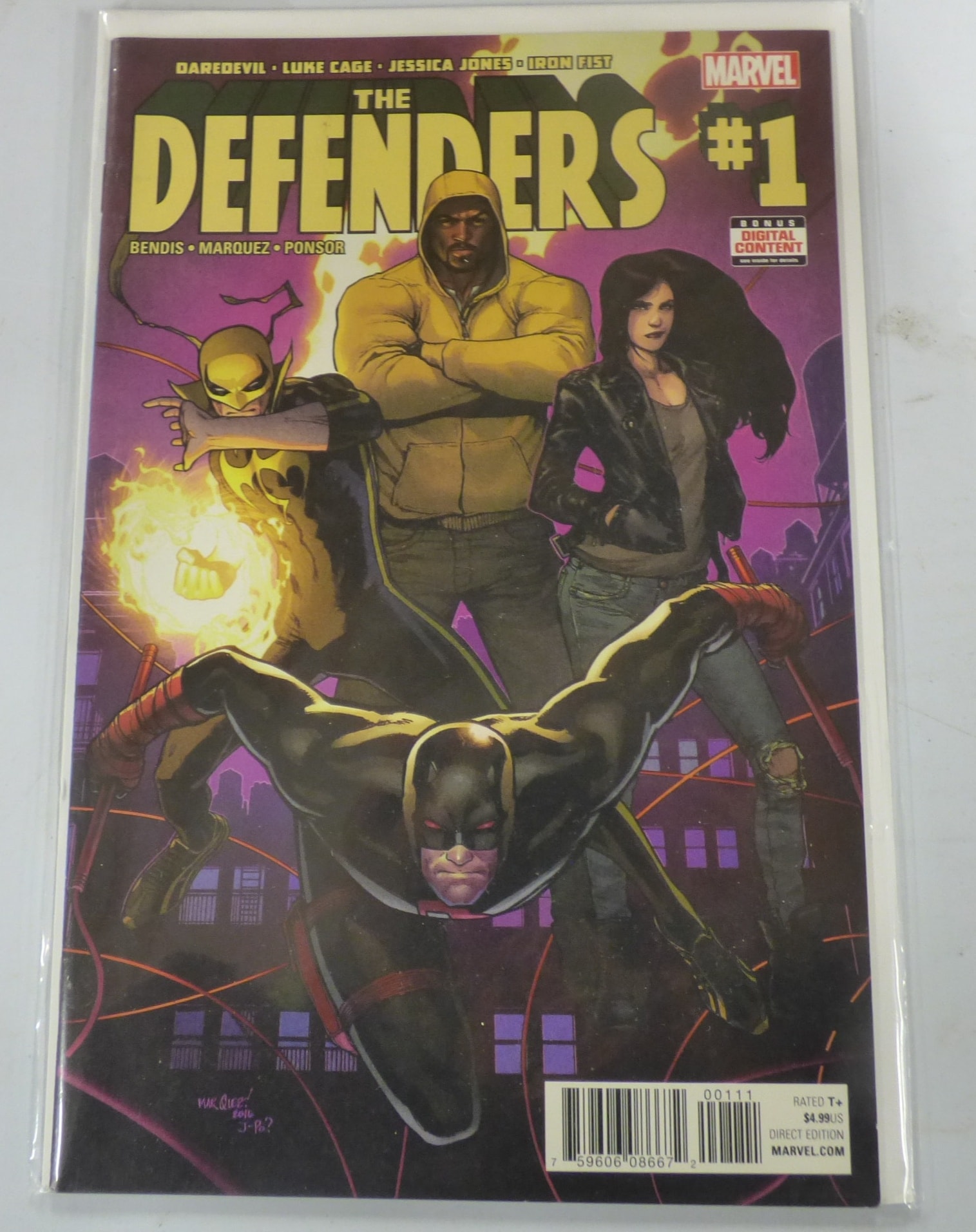 A Marvel comic book titled “THE DEFENDERS #1” by Bendis, Marquez, and Ponsor, featuring Daredevil, Luke Cage, Jessica Jones, and Iron Fist on a vibrant black, yellow, red, and purple cover, with a visible price of $4.99US and a handwritten inscription that appears to read “MARQUEZ! 2010 J-Po?”.
