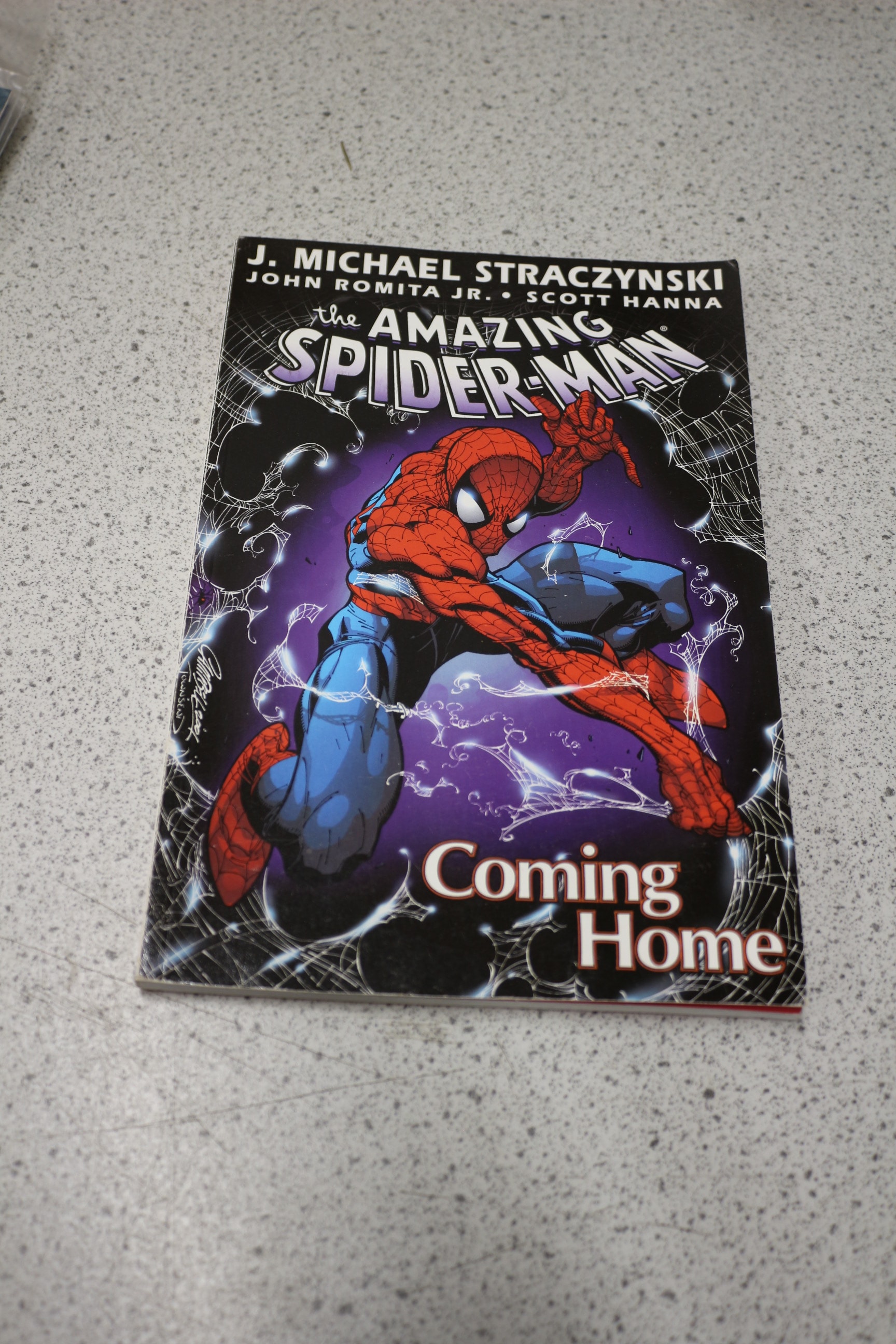 A comic book graphic novel, “The AMAZING SPIDER-MAN: Coming Home, ” predominantly black and purple with red and blue artwork of Spider-Man, featuring visible text including “J. MICHAEL STRACZYNSKI, ” “JOHN ROMITA JR., ” and “SCOTT HANNA.”