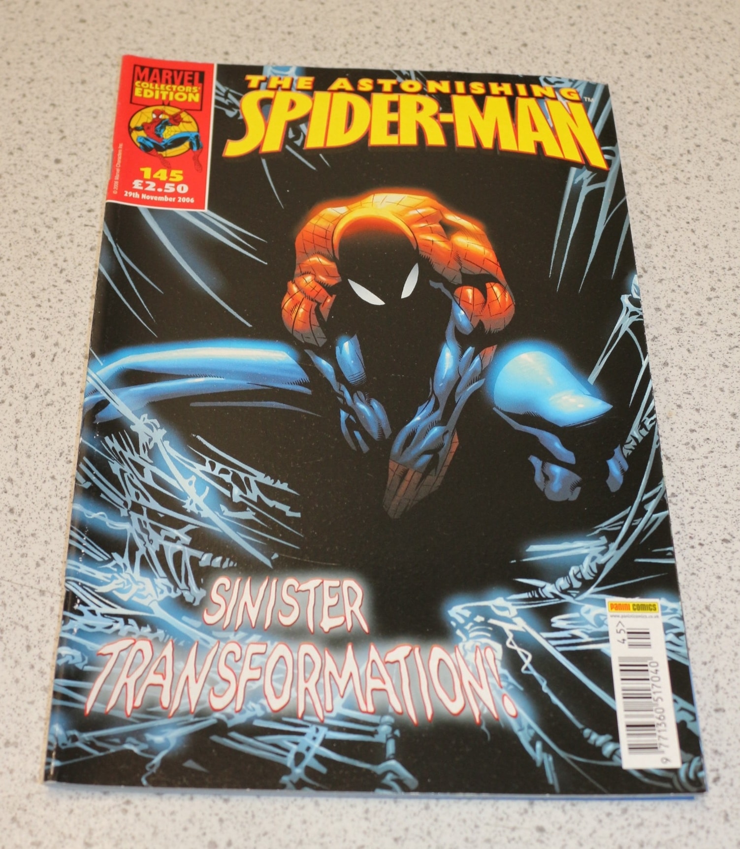 A comic book titled ‘THE ASTONISHING SPIDER-MAN’, issue 145, with black, red, and blue colours, featuring ‘MARVEL COLLECTORS’ EDITION’, ‘SINISTER TRANSFORMATION!’, and ‘PANINI COMICS’.