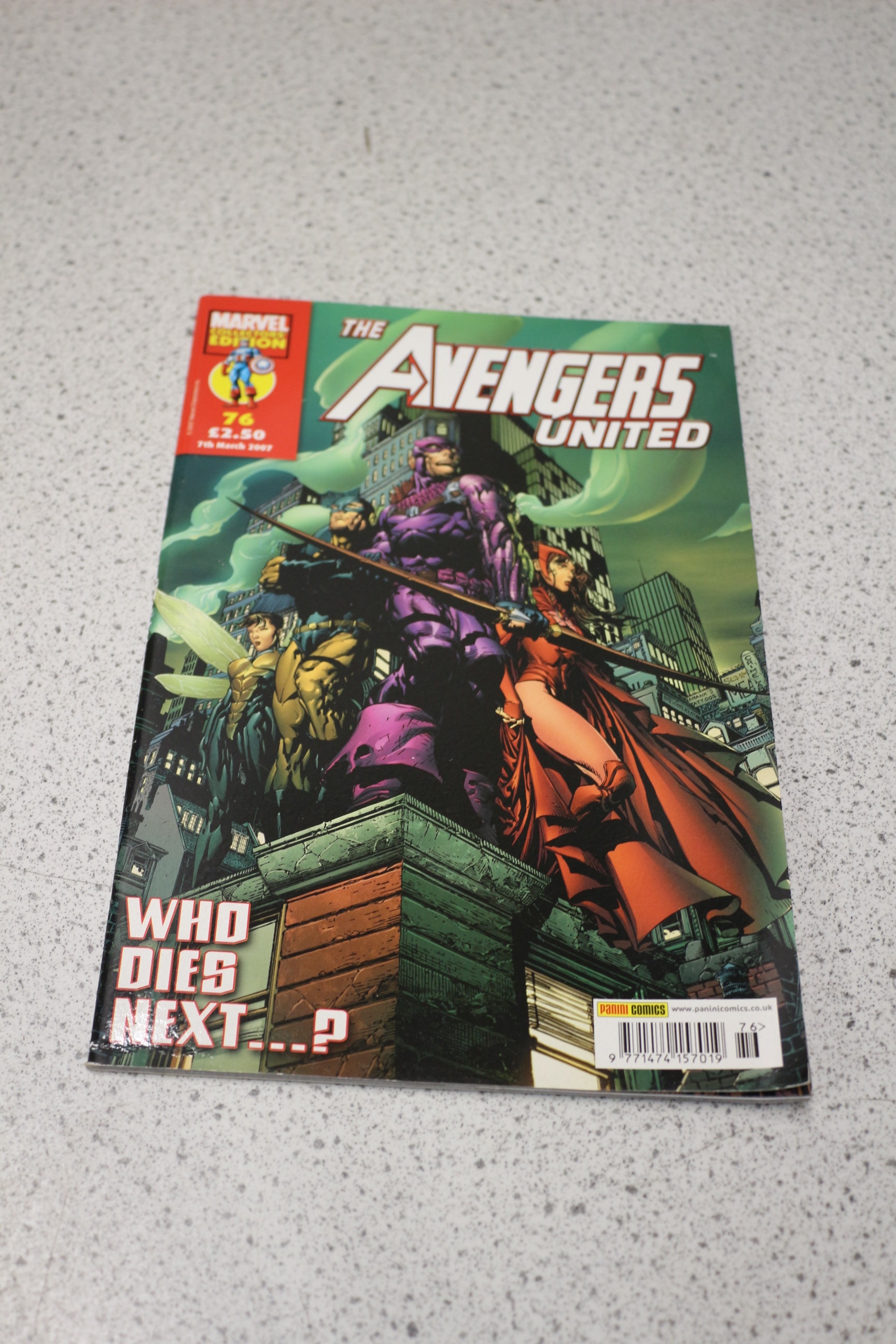 A multi-coloured Marvel Ultimate Edition comic book titled “The Avengers United, ” issue 76, published by Panini Comics on 7th March 2007, featuring “WHO DIES NEXT…?” on its cover and priced at £2.50.