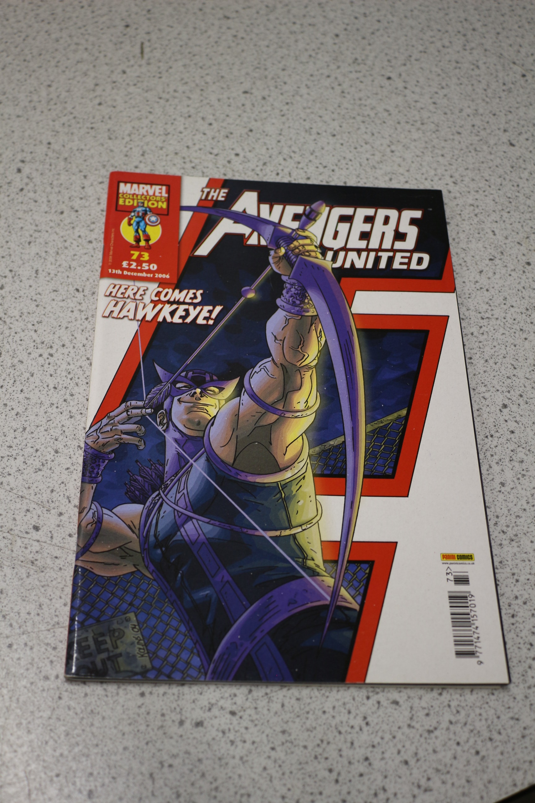 A dark blue, purple, red, and white Marvel Collectors Edition comic book titled ‘The Avengers United: Here Comes Hawkeye!’, issue 73, published by Panini Comics on 13th December 2006, with ‘KEEP OUT’ and ‘Kalas 04’ visible in the artwork.