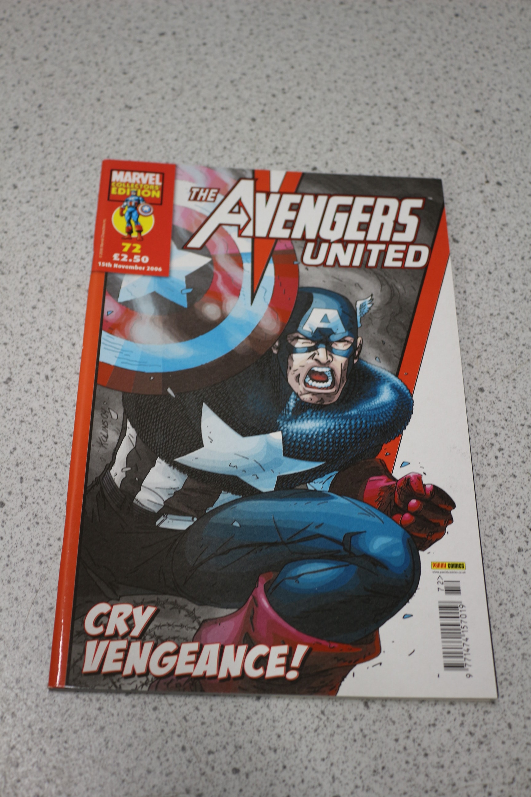 A comic book titled “THE AVENGERS UNITED” featuring Captain America, marked “MARVEL COLLECTORS EDITION”, issue 72, priced at £2.50, dated “15th November 2006”, with the story “CRY VENGEANCE!”, published by PANINI COMICS and signed “KOLLINS ’04”.