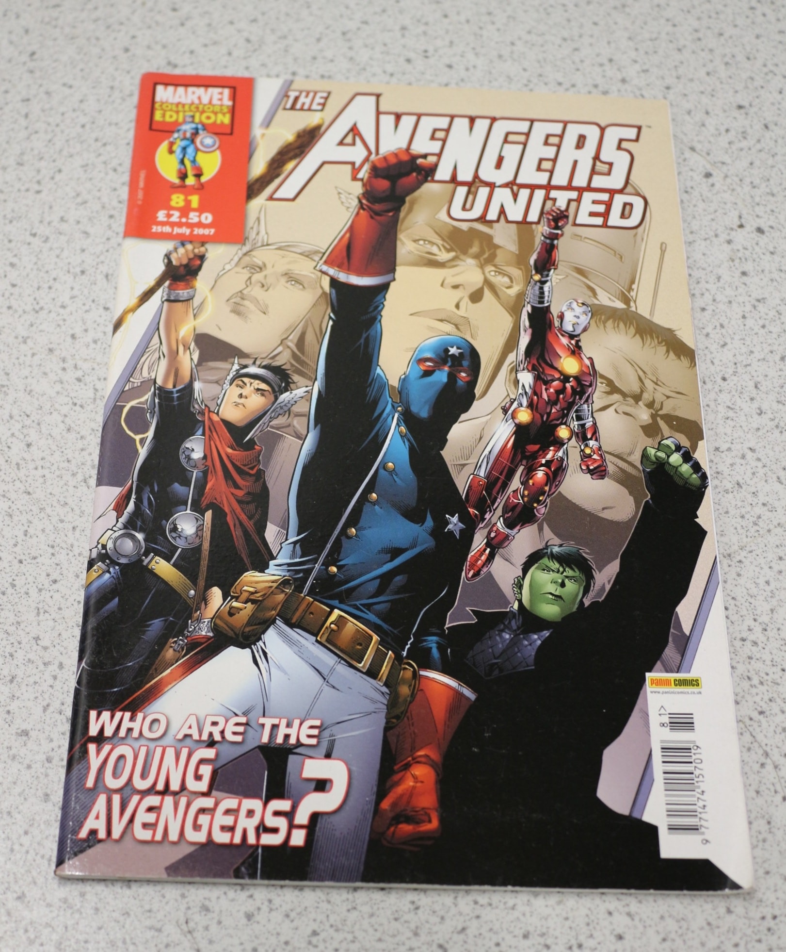 A multi-coloured Marvel Collectors Edition comic book titled ‘The Avengers United’, issue 81, dated 25th July 2007, featuring ‘WHO ARE THE YOUNG AVENGERS?’ on the cover, with a Panini Comics logo.