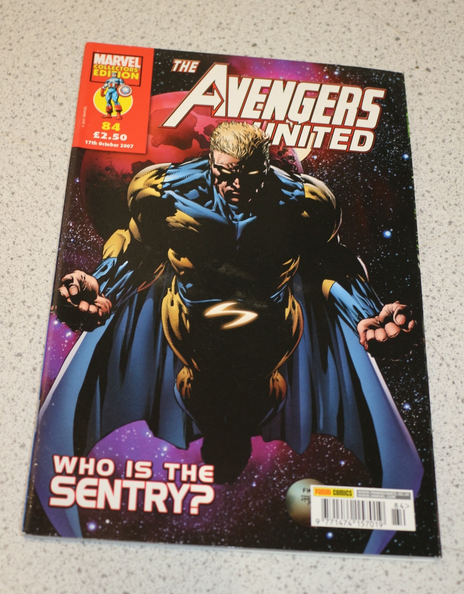 A comic book, ‘The Avengers United’ issue 84, dated 17th October 2007, featuring the Sentry in blue, gold, and black attire, published by Panini Comics as a Marvel Collectors Edition.