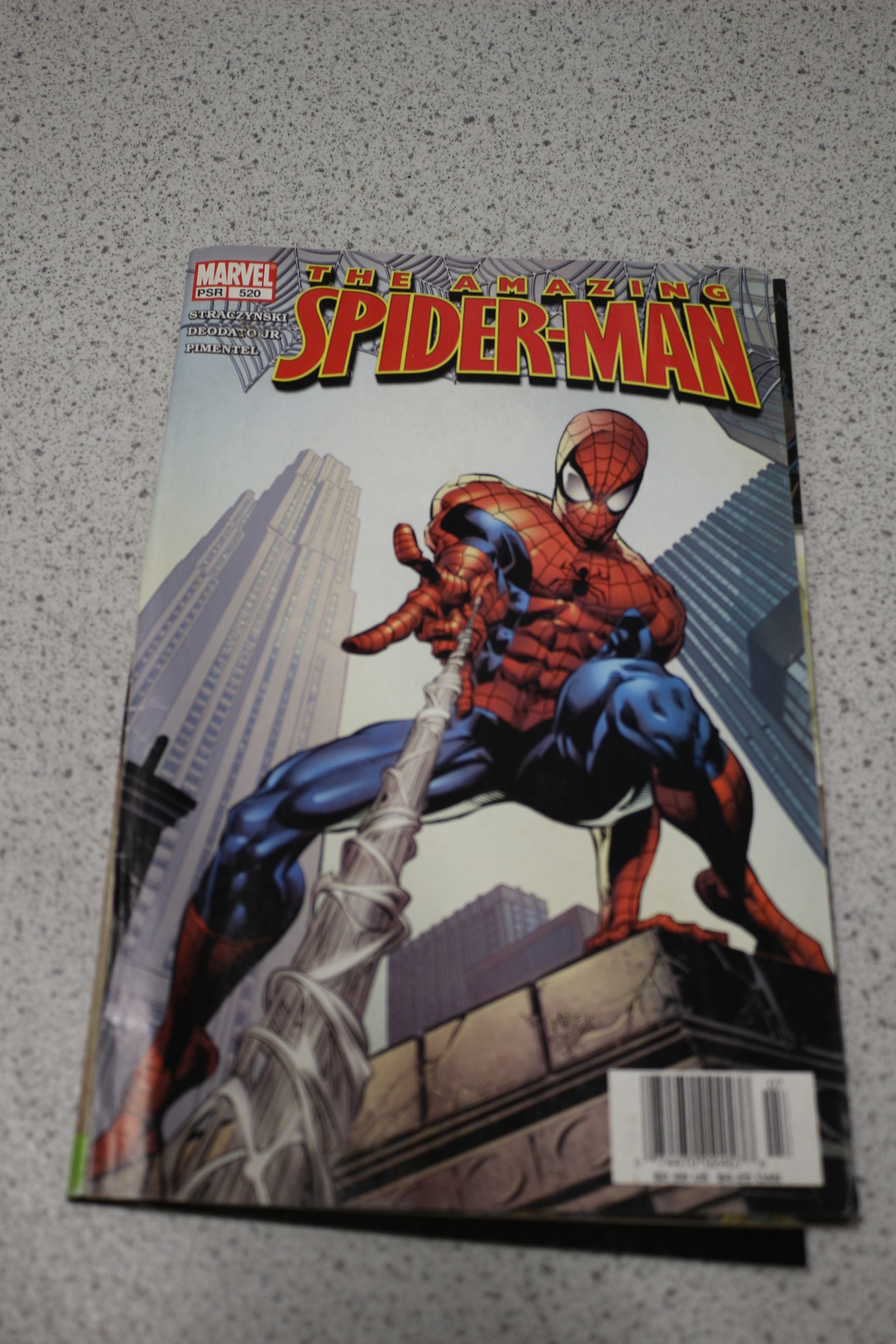 A single ‘The Amazing Spider-Man’ comic book from 2005, primarily red, blue, and white, featuring MARVEL, PSR 520, STRACZYNSKI, DEODATO JR, and PIMENTEL labels.