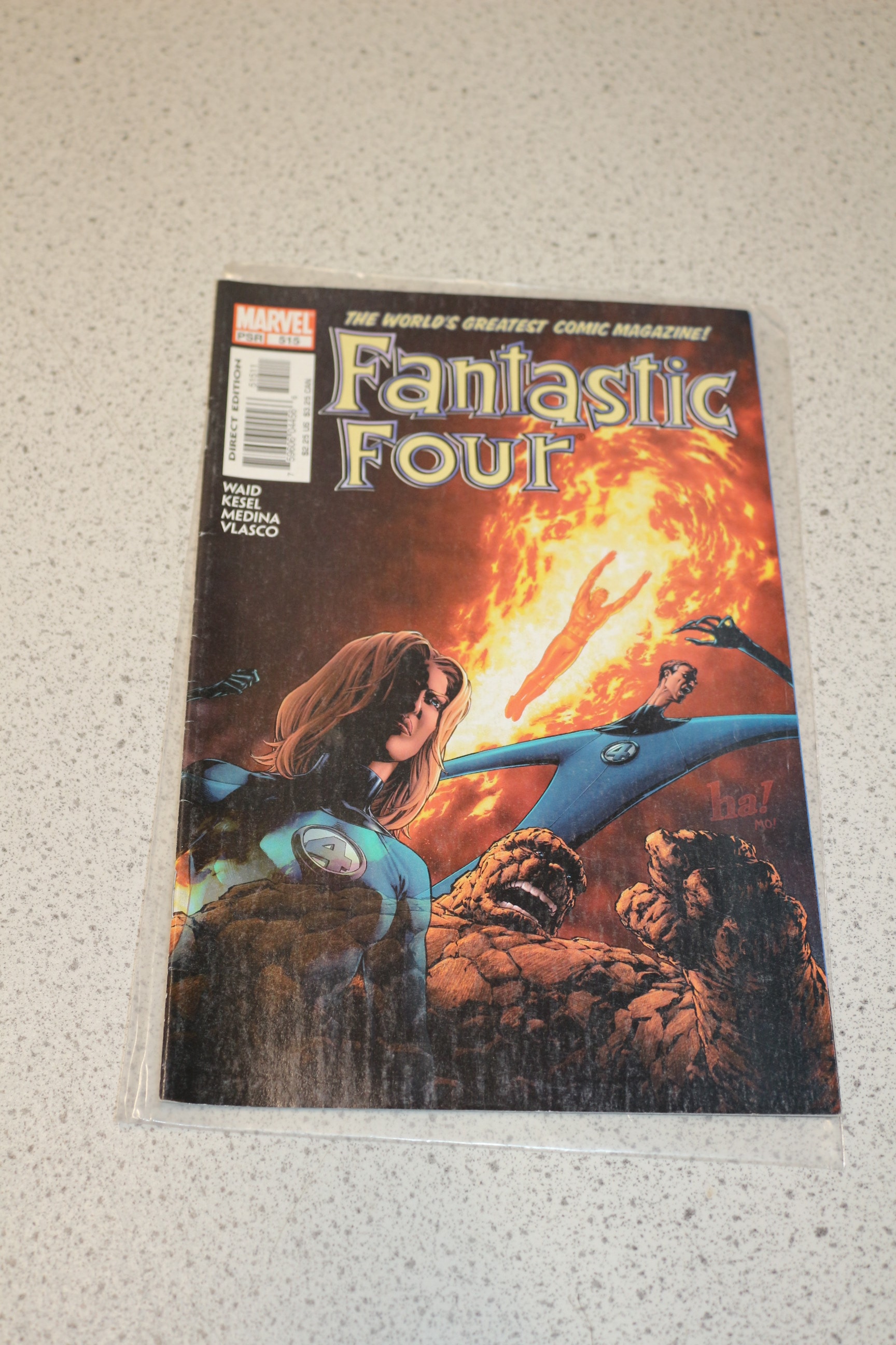 A Marvel Fantastic Four comic book, PSR 515, a Direct Edition, with a cover featuring characters in blue, orange, and brown against an orange background, displaying text ‘WAID KESEL MEDINA VLASCO’ and a price of $2.25 US / $3.25 CAN.