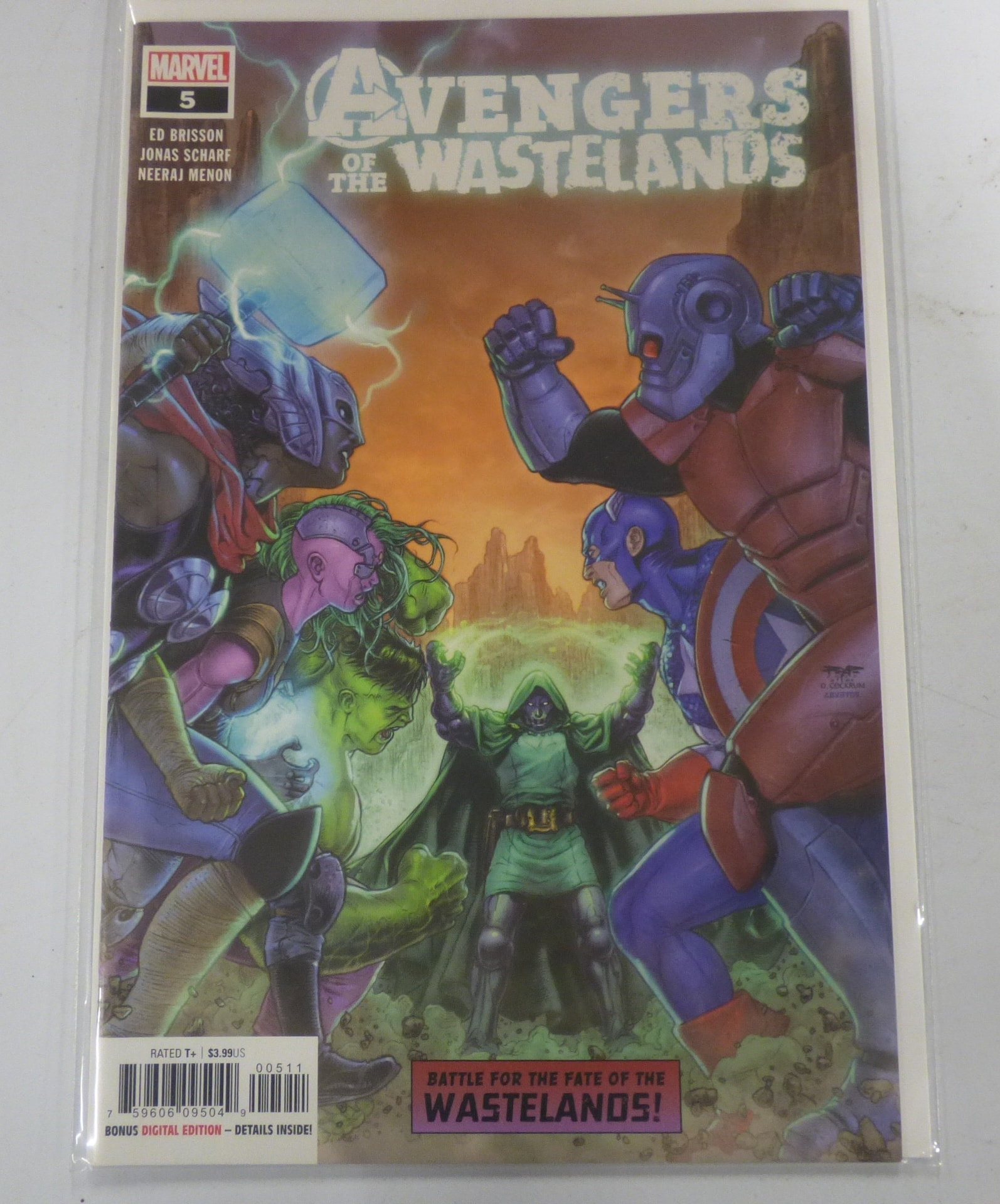 A Marvel comic book, “Avengers of the Wastelands” issue #5, features a multi-colored cover depicting various characters, lists creators Ed Brisson, Jonas Scharf, and Neeraj Menon, and includes a $3.99US price and “BONUS DIGITAL EDITION” label.