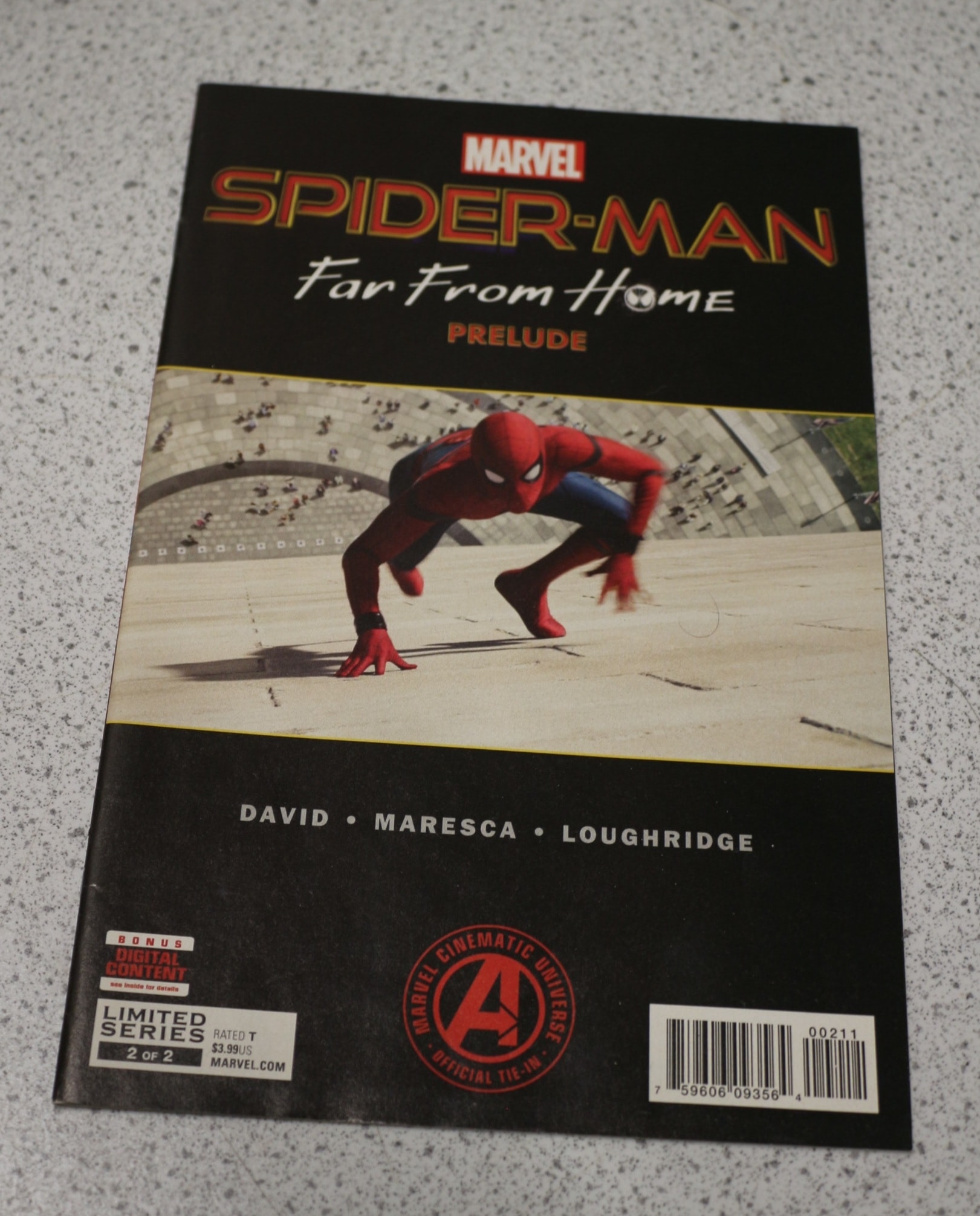 A black comic book titled ‘MARVEL SPIDER-MAN Far From Home PRELUDE, ‘ issue 2 of 2, featuring Spider-Man in red and blue, rated T, with bonus digital content and an official Marvel Cinematic Universe tie-in.