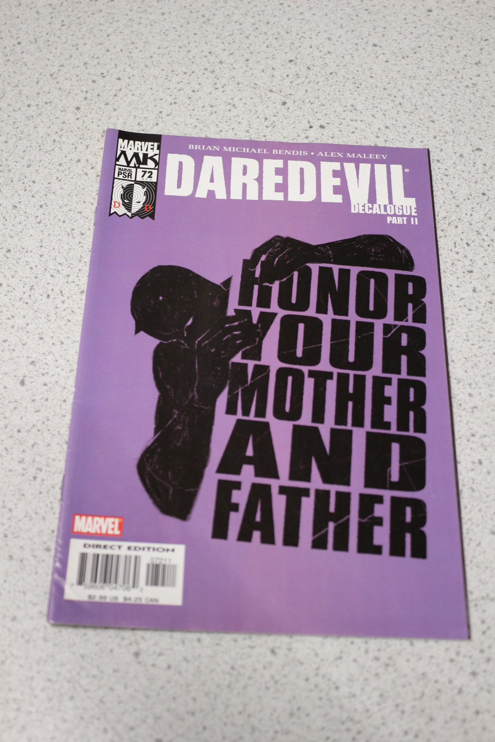 A purple, black, and white Marvel Daredevil comic book, issue #72, titled “Decalogue Part II, ” by Brian Michael Bendis and Alex Maleev, a “Direct Edition” featuring “HONOR YOUR MOTHER AND FATHER” on the cover, originally priced at $2.99 US.